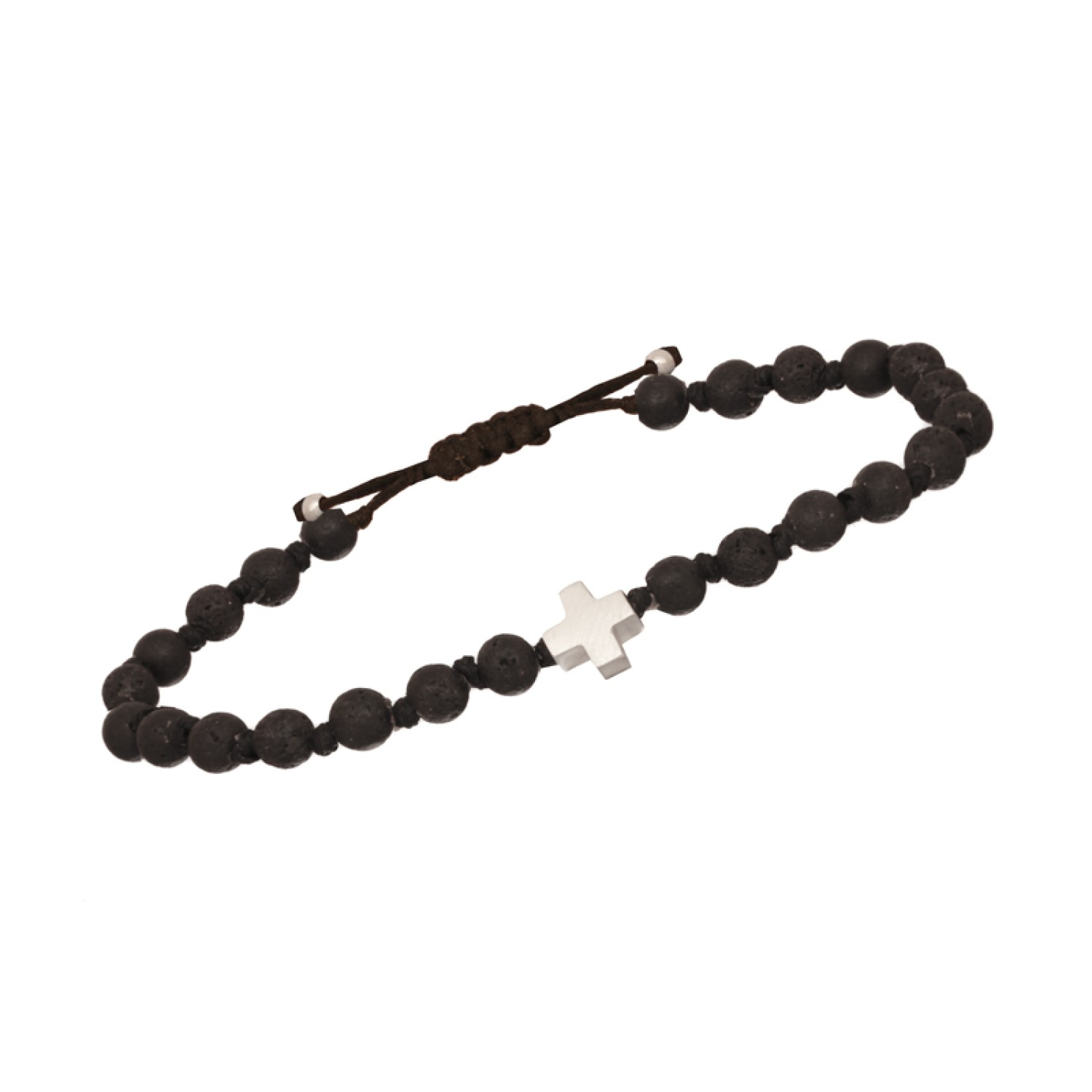 Βραχιόλι κορδόνι ασημένιος Σταυρός Πέτρες Λάβα