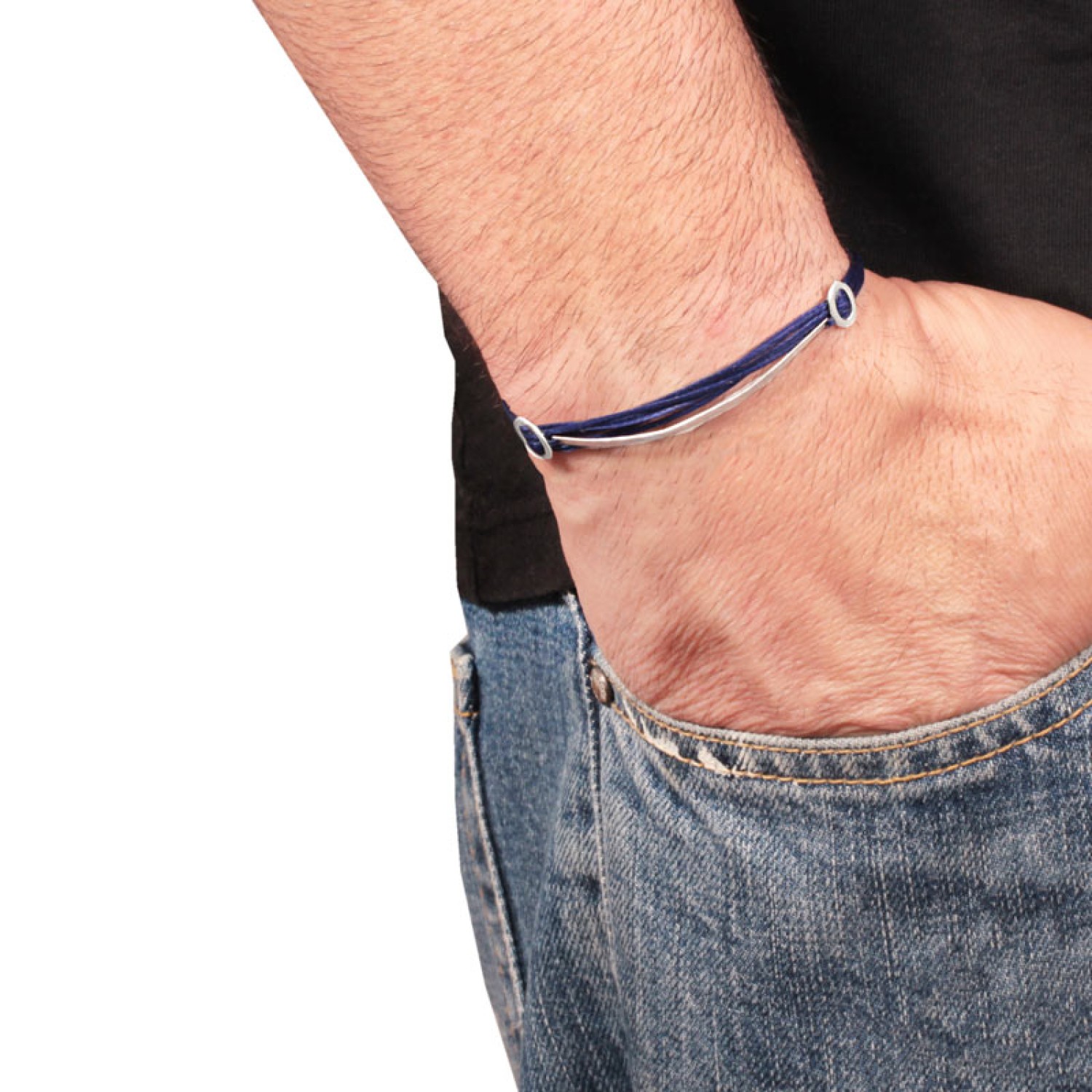 Ανδρικό βραχιόλι μπλέ κηροκλωστές με ασημένια 925 επιπλατινωμένη Μπάρα και οβάλ περίγραμμα κύκλους Stops. Ενα χειροποιήτο κόσμημα που συνδυάζει minimal στύλ και διακριτική λάμψη. Τα πολλά λεπτά νήματα θα στολίσουν το χέρι σας μαγνητίζοντας όλα τα βλέμματα επάνω σας. Ενω το κομψό μέγεθος είναι ιδανικό για να το φορέσετε μαζί με αλλα και να μην το αποχωριστείτε λεπτό. Μια εξαιρετική επιλογή και για ενα προσωπικό δώρο για όσους αγαπούν τα διαχρονικά κομμάτια. Σημειώστε ότι τα κορδόνια είναι εξαιρετικής ποιότητας και αντοχής. Διαθέτει πλακέ κούμπωμα για να αγκαλιάσει απόλυτα τον καρπό σας.
