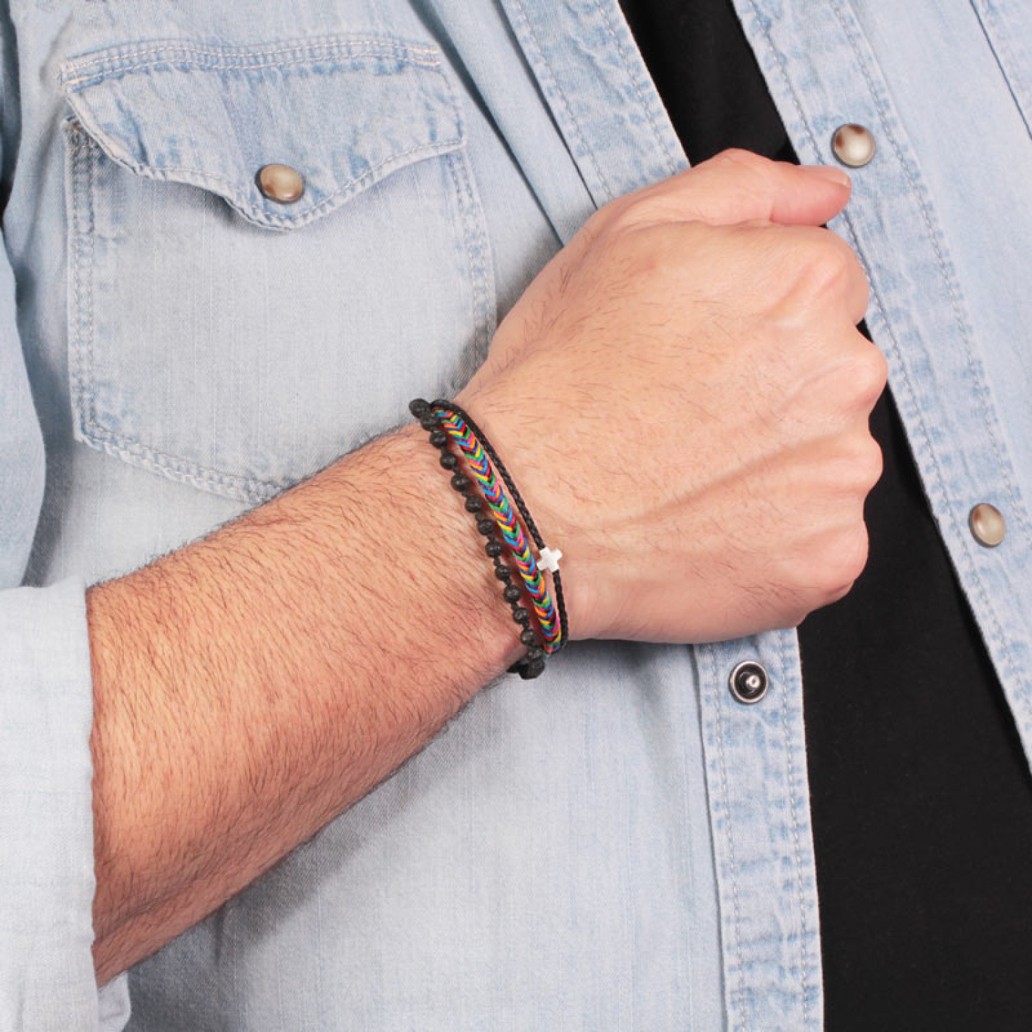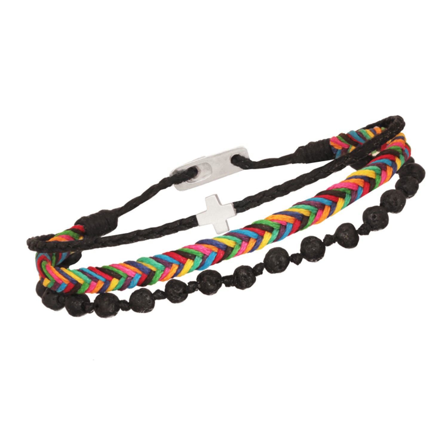 Βραχιόλι κορδόνια ασημένιος Σταυρός πέτρες Λάβα