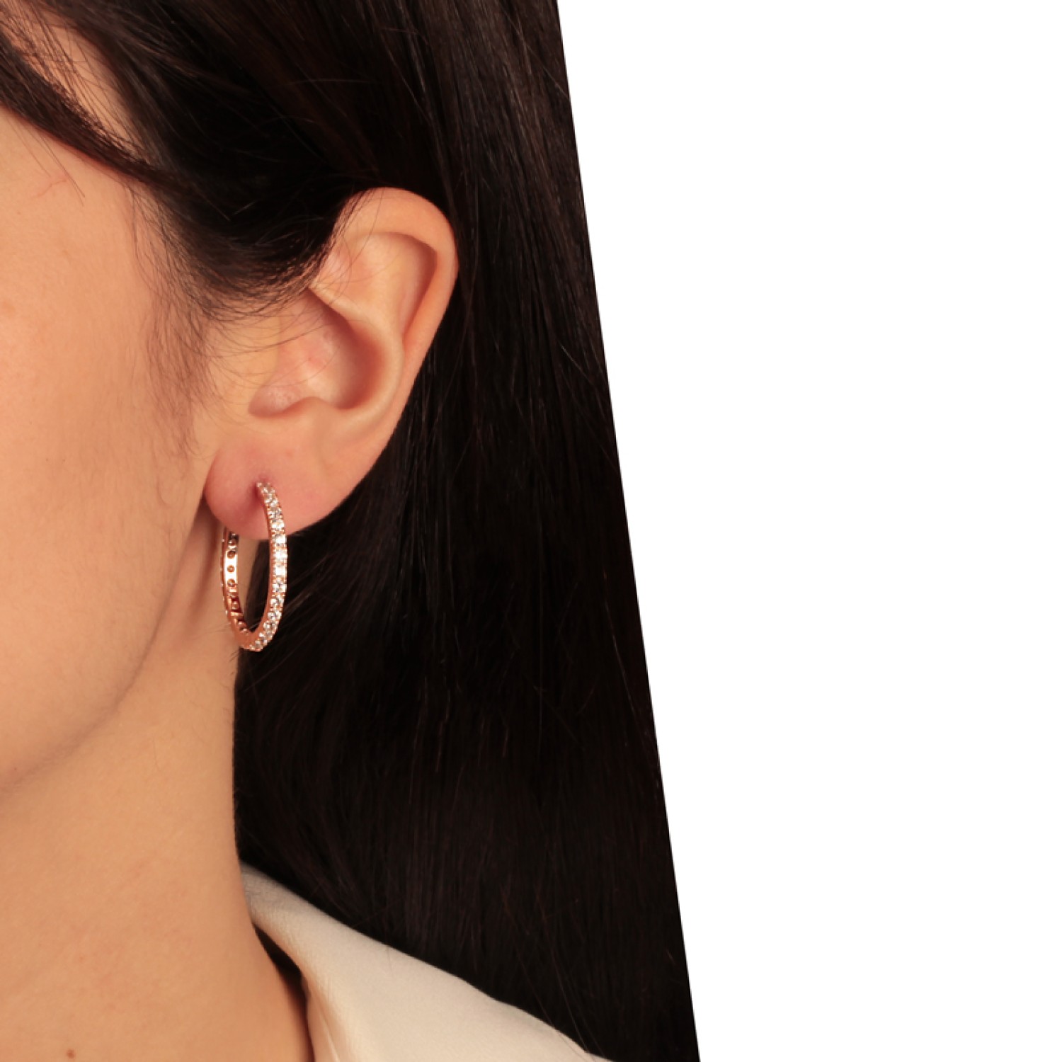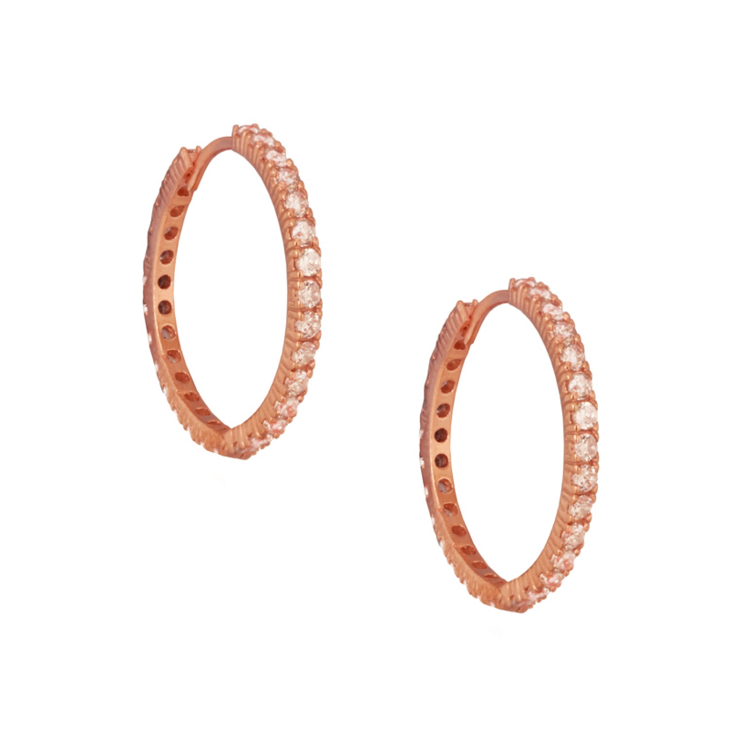Γυναικεία ασημένια 925 ρόζ επιχρυσωμένα σε 18k χρυσό τρυπητά σκουλαρίκια tennis huggies Κρίκοι 25.00 χιλιοστά. Κατα μήκος λευκά σειρέ ζιργκόν προσδίδουν πολυτέλεια, αντανακλώντας λάμψη με κάθε σας κίνηση. Το μεγάλο μέγεθος είναι ιδανικό για πρώτες τρύπες και mix match συνδυασμούς. Ενα υπέροχο ζευγάρι με κλασσικό σχέδιο και διαχρονική κομψότητα που αξίζει μια θέση στην συλλογή σας. Προτείνουμε να το χαρίσετε και ως ενα προσωπικό δώρο που θα εντυπωσιάσει.