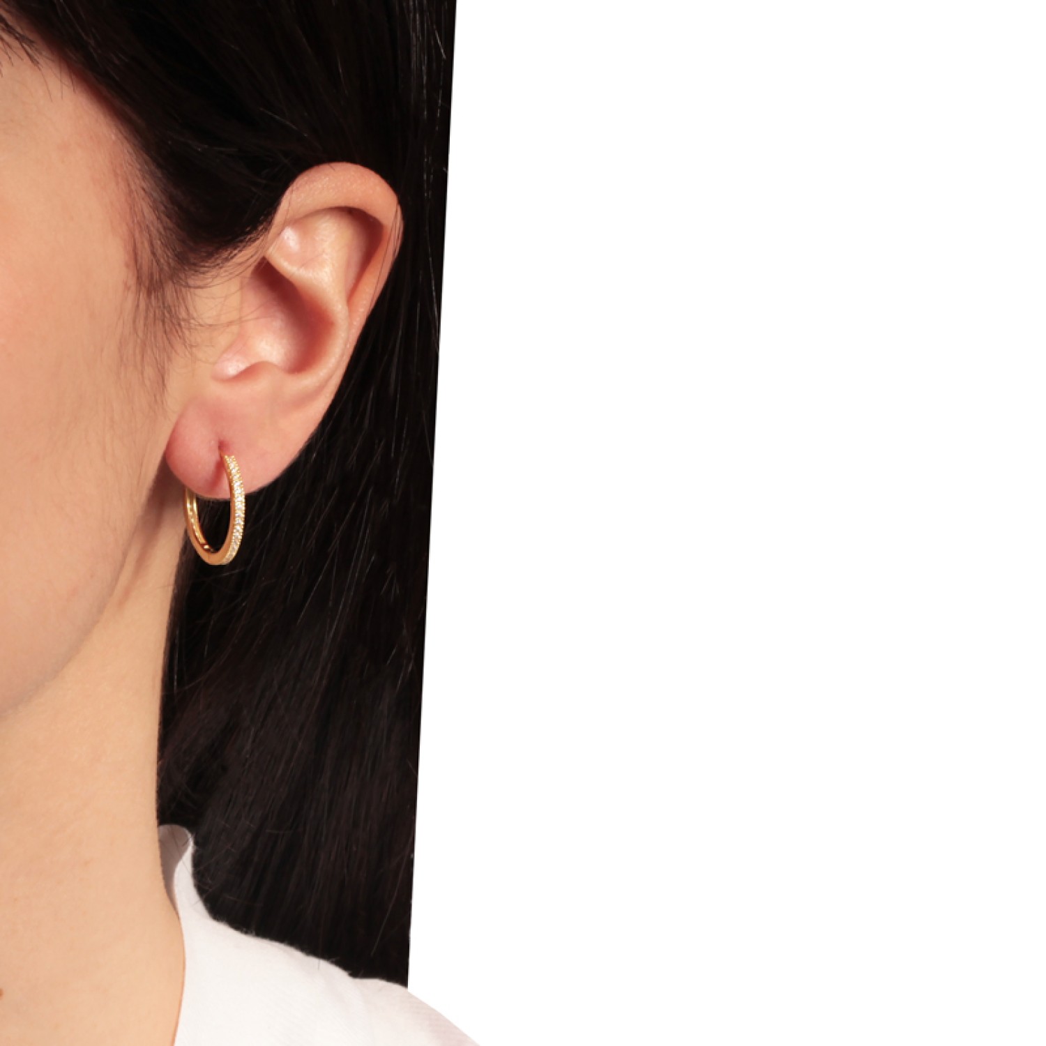 Γυναικεία ασημένια 925 επίχρυσα σε 18k χρυσό τρυπητά σκουλαρίκια tennis huggies Κρίκοι 17.00 χιλιοστά με pave καρφωμένα λευκά ζιργκόν. Ενα κλασσικό σχέδιο που συνδυάζει κομψότητα και διαχρονικότητα. Το μεσαίο προς μεγάλο μέγεθος και οι εκτυφλωτικές πέτρες τους θα μεταμορφώσουν κάθε chic εμφάνιση, αντανακλώντας απαράμιλλη λάμψη απο κάθε γωνία. Ενα υπέροχο ζευγάρι που αξίζει μια θέση στην κοσμηματοθήκη σας. Μια εξαιρετική πρόταση για εσάς ή για ενα προσωπικό δώρο με πολυτέλεια.