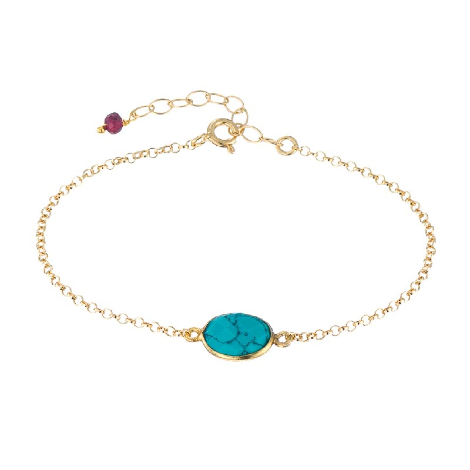 Γυναικείο ασημένιο 925 επίχρυσο σε 18 καράτια χρυσό βραχιόλι με πέτρα Τιρκουάζ. Ο πιο αγαπημένος λίθος Τύχης και Προστασίας σε ενα κλασσικό κόσμημα που θα αγαπήσετε με την πρώτη ματιά. Το κομψό μέγεθος είναι ιδανικό να το συνδυάσετε και με αλλα για ενα chic look. Η αλυσίδα χεριού διαθέτει προέκταση κρίκους για να το προσαρμόσετε στον καρπό σας. Μια εξαιρετική επιλογή και για ενα προσωπικό δώρο με πολυτέλεια και συμβολισμό.