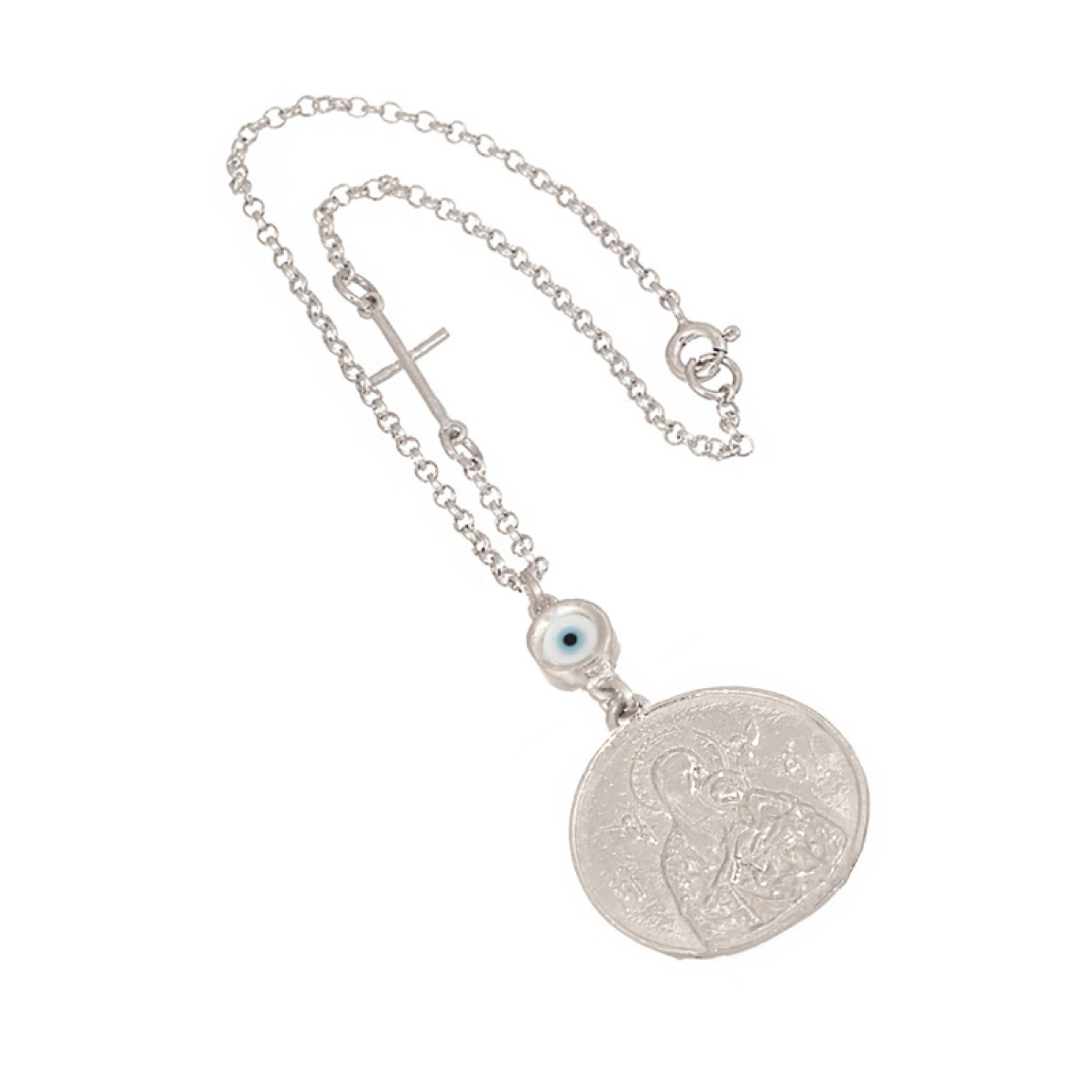 Γούρι Αυτοκινήτου ασημένιο 925 επιπλατινωμένο κρεμαστό Μάτι με στρογγυλή Εικόνα και Σταυρό στην αλυσίδα. Το κλασσικό φυλαχτό είναι διπλής όψεως και απεικονίζει τον Άγιο Χριστόφορο γνωστό και ως προστάτη των οδηγών και απο την άλλη την Παναγία. Ενα υπέροχο κομμάτι που συνδυάζει κομψότητα και διαχρονικότητα. Μια εξαιρετική επιλογή για άντρα ή για γυναίκα. Κρεμάστε το στο δικό σας ή χαρίστε το με τις εγκάρδιες ευχές σας και καλοτάξιδο να είναι το νέο αμάξι. Ενα παντοτινό δώρο με προσιτή τιμή και πολυτέλεια.
