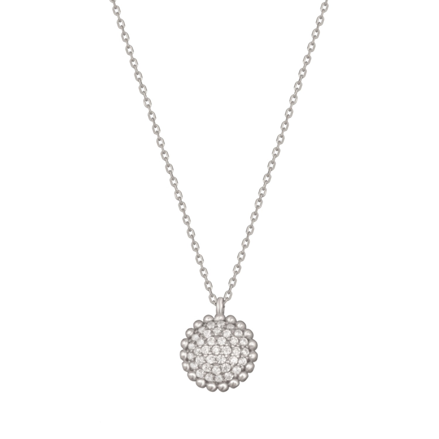 Γυναικείο ασημένιο 925 επιπλατινωμένο κολιέ μενταγιόν μπούλ Δίσκος. Το κυκλικό κρεμαστό έχει pave καρφωμένα λευκά ζιργκόν, ενω περιμμετρικά στολίζετε απο ενα στεφάνι με mini μπίλιες. Ενα κομψό κόσμημα με ιδανικό μέγεθος για να το φορέσετε κάθε στιγμή της ημέρας. Θα χαρίσει λάμψη και λεπτομέρεια σε κάθε εμφάνιση. Φορέστε το μόνο του ή συνδυάστε το με άλλα παρόμοια για ενα layered look. Μια εξαιρετική επιλογή για εσάς ή για ενα προσωπικό δώρο με προσιτή τιμή. Διαθέτει προέκταση κρίκους για να το προσαρμόσετε στο ύψος ντεκολτέ που επιθυμείτε.