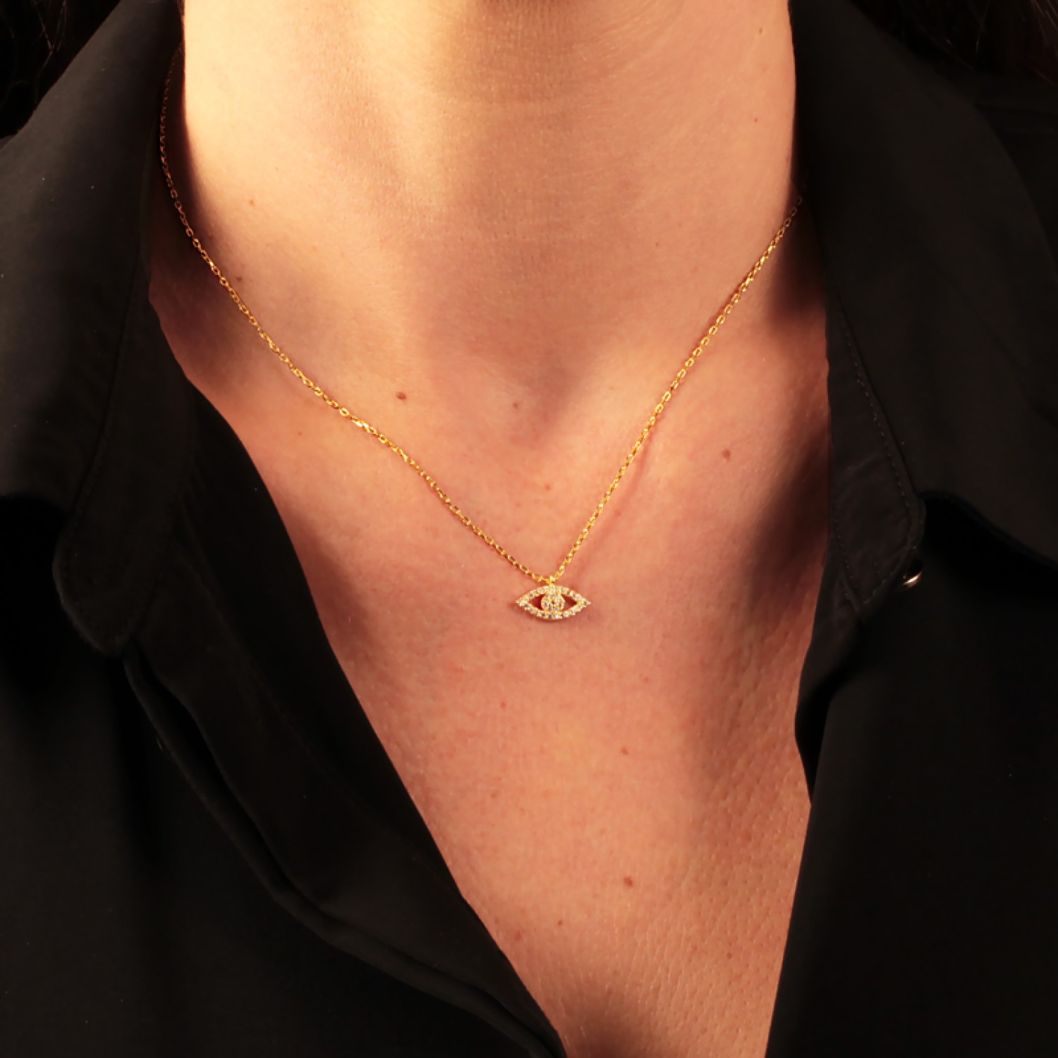 Γυναικείο ασημένιο 925 επίχρυσο σε 18 καράτια χρυσό κολιέ μενταγιόν σχήμα Μάτι με Κύκλο. Το εντυπωσιακό μοτίφ είναι στολισμένο με pave καρφωμένα λευκά ζιργκόν να αντανακλούν με κάθε κίνηση. Ενα κλασσικό σύμβολο Τύχης και Προστασίας σε κομψή έκδοση. Η αλυσίδα λαιμού διαθέτει προέκταση κρίκους για να το προσαρμόσετε στο ύψος ντεκολτέ που επιθυμείτε και να το συνδυάσετε και με αλλα για layering look. Εξαιρετική επιλογή και για ενα διαχρονικό δώρο με προσιτή τιμή και πολυτέλεια.