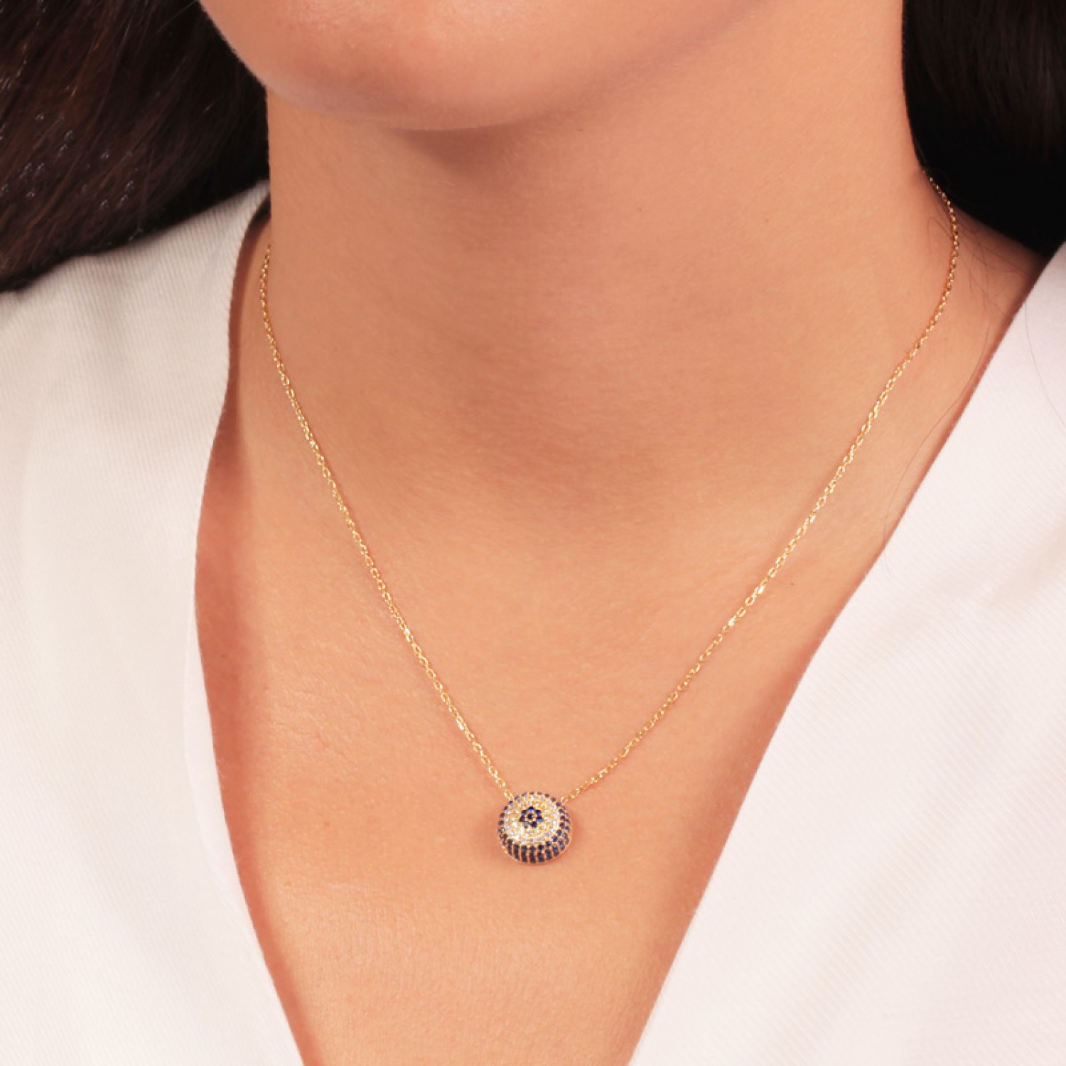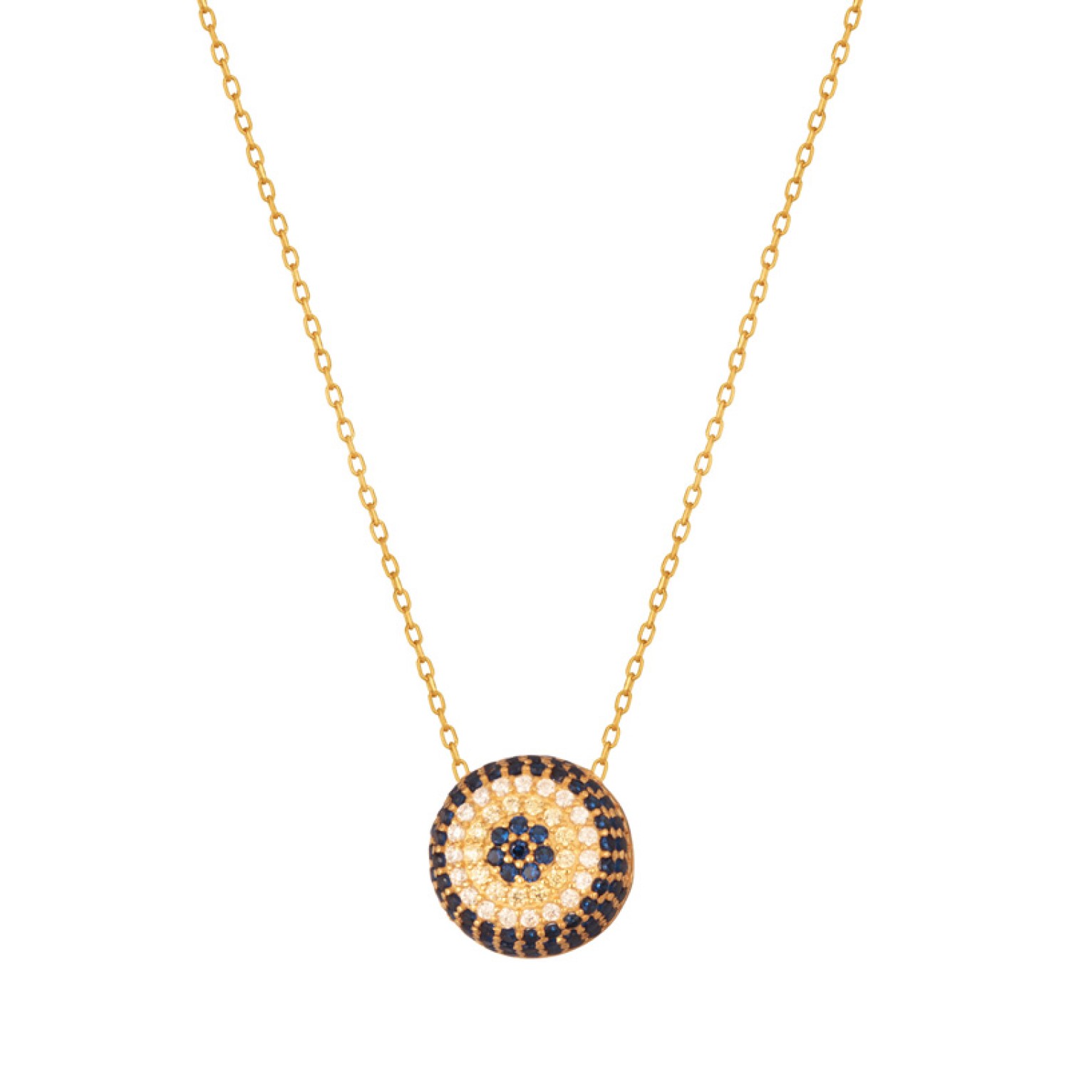 Γυναικείο ασημένιο 925 επίχρυσο σε 18 καράτια χρυσό κολιέ μενταγιόν μπούλ Κύκλος Μάτι. Το υπέροχο κρεμαστό είναι στολισμένο με pave καρφωμένα μπλέ και λευκά ζιργκόν που δημιουργούν ενα μοναδικό εφέ σαν στόχο. Το πιο αγαπημένο σύμβολο Τύχης και Προστασίας σε πολυτελής έκδοση. Διαθέτει προέκταση κρίκους για να το προσαρμόσετε στο ύψος ντεκολτέ που επιθυμείτε για layering looks. Ιδανικό για εσάς ή για ενα ξεχωριστό δώρο με ξεχωριστό νόημα.