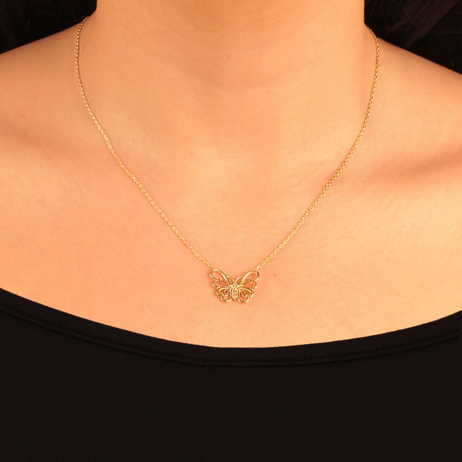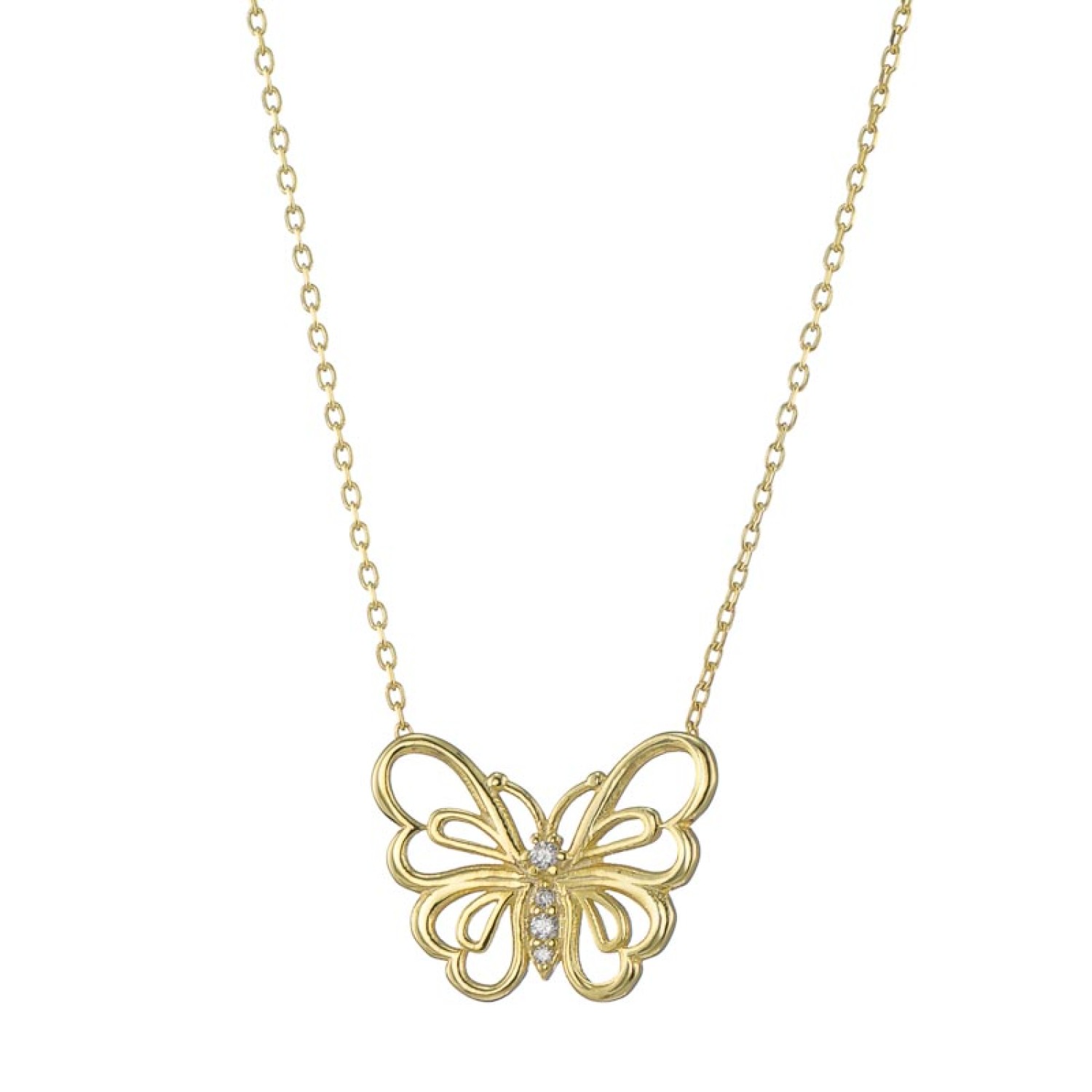 Γυναικείο ασημένιο 925 επίχρυσο σε 18 καράτια χρυσό κολιέ μενταγιόν περίγραμμα Πεταλούδα στολισμένη εσωτερικά με λευκά ζιργκόν. Ενα ρομαντικό κόσμημα που θα χαρίσει στύλ και λάμψη σε κάθε εμφάνιση. Το μεασίο μέγεθος είναι ιδανικό για να στολίσει το ντεκολτέ σας απο το πρωί. Ιδανική επιλογή και για ενα προσωπικό δώρο με ξεχωριστό νόημα.