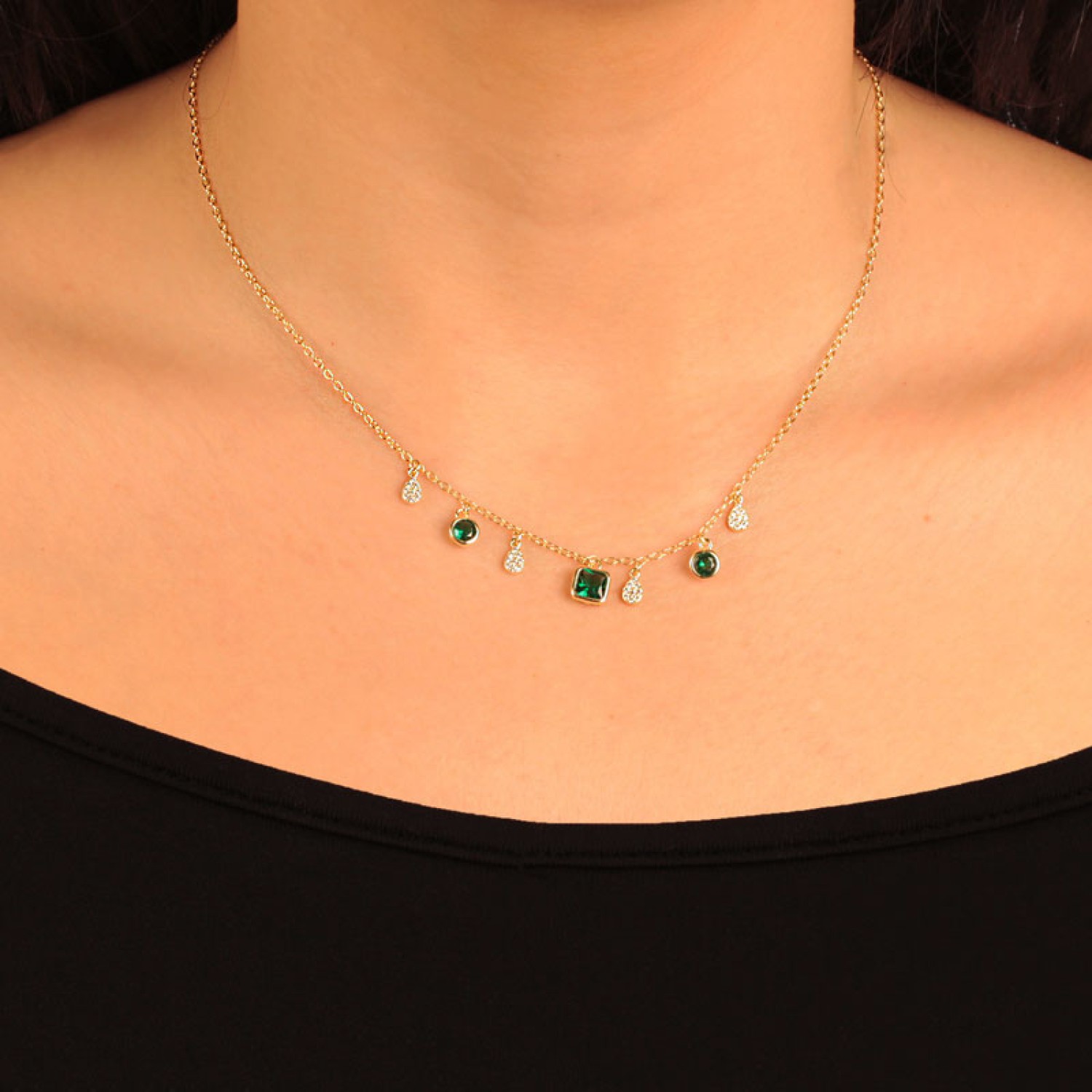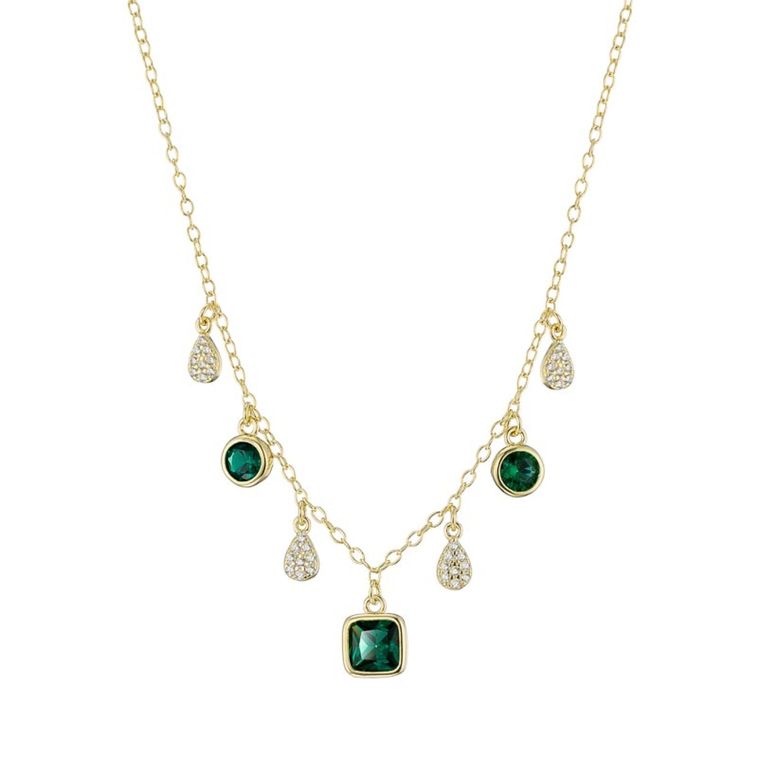 Γυναικείο ασημένιο 925 επίχρυσο κολιέ Retro Drops Αλυσίδα με κρεμαστά Μονόπετρα πράσινα ζιργκόν και Σταγόνες με λευκά. Ενα υπέροχο κόσμημα που συνδυάζει περίτεχνο σχέδιο και σμαραγδένιο χρώμα. Τα κομψά μοτίφ θα στολίσουν το ντεκολτέ σας αντανακλώντας λάμψη με κάθε σας κίνηση. Η αλυσίδα λαιμού διαθέτει προέκταση κρίκους για να το φορέσετε στο ύψος που θέλετε μόνο του ή μαζί με άλλα για layering look.