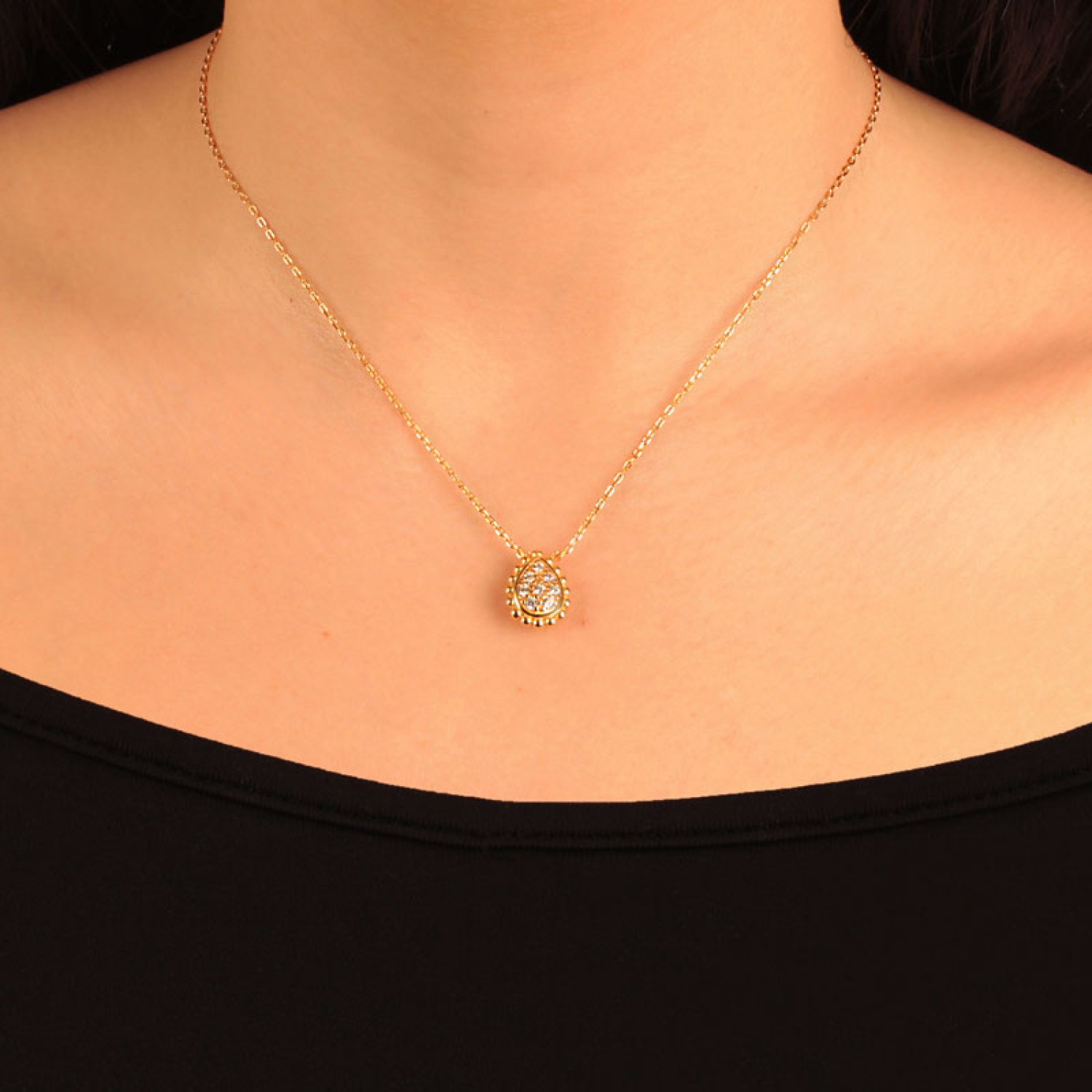 Γυναικείο ασημένιο 925 επίχρυσο σε 18 καράτια χρυσό Κολιέ μενταγιόν Λαχούρι Σταγόνα στολισμένη με λευκά ζιργκόν. Ενα υπέροχο κόσμημα με λάμψη και στύλ που θα μεταμορφώσει κάθε εμφάνιση Η αλυσίδα λαιμού διαθέτει προέκταση κρίκους για να το προσαρμόσετε στο ύψος ντεκολτέ που επιθυμείτε και να το συνδυάσετε για ενα fashion layering look.