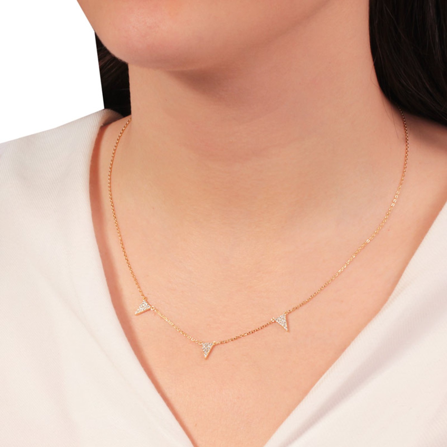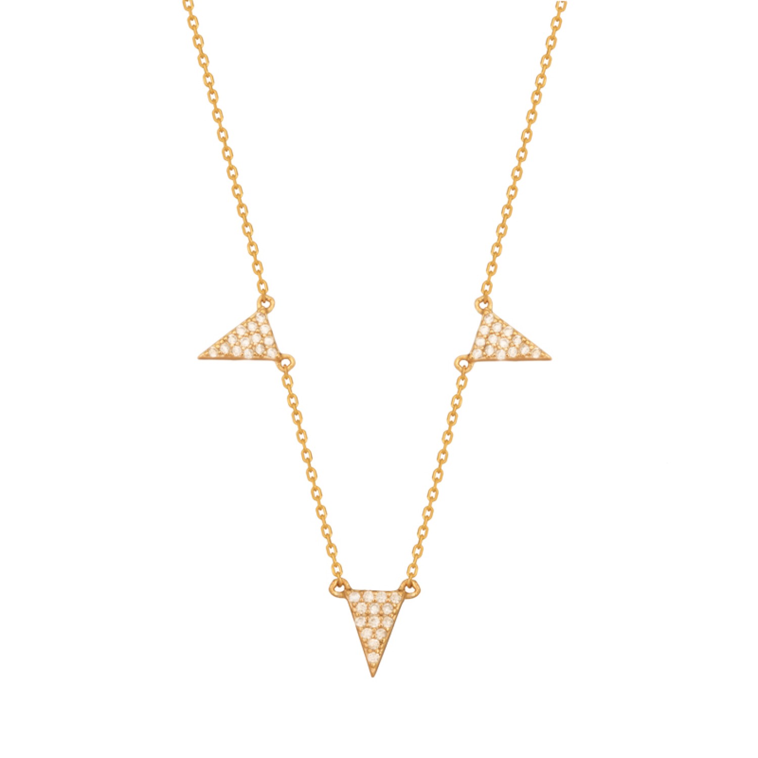 Γυναικείο ασημένιο 925 επίχρυσο σε 18k χρυσό κολιέ Τρίγωνα pave καρφωμένα λευκά ζιργκόν. Τα τρία κρεμαστά θα στολίσουν ντεκολτέ σας αντανακλώντας απαράμιλλη λάμψη με κάθε σας κίνηση. Ενω το κομψό μέγεθος είναι ιδανικό για να το συνδυάσετε με αλλα για ενα fashion layering look. Σίγουρα ενα και εντυπωσιακό και θα είστε στην κορυφή της μόδας. Η αλυσίδα λαιμού διαθέτει τρείς ενδιάμεσους κρίκους για να το προσαρμόσετε στο ύψος που επιθυμείτε.