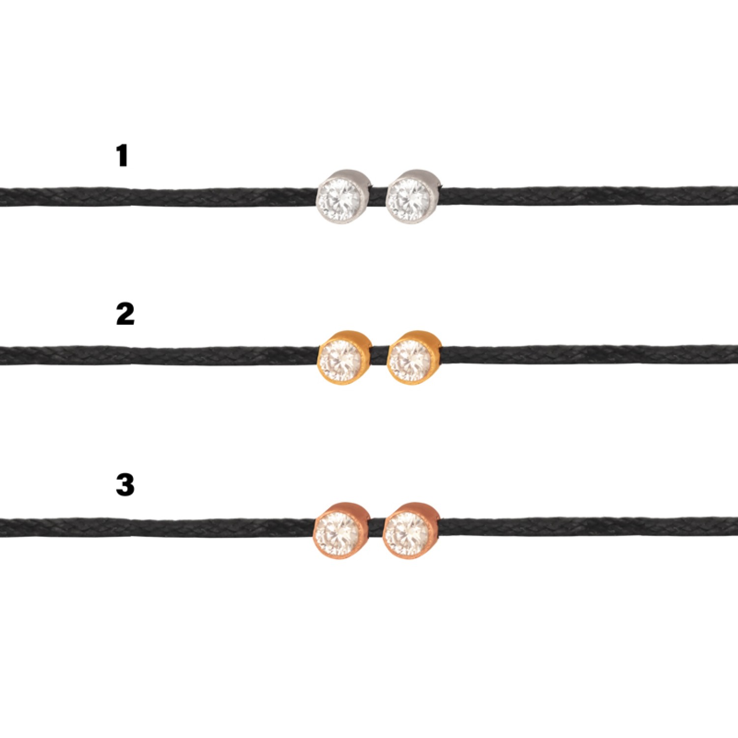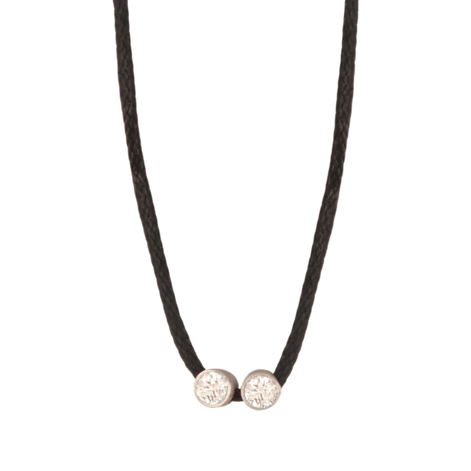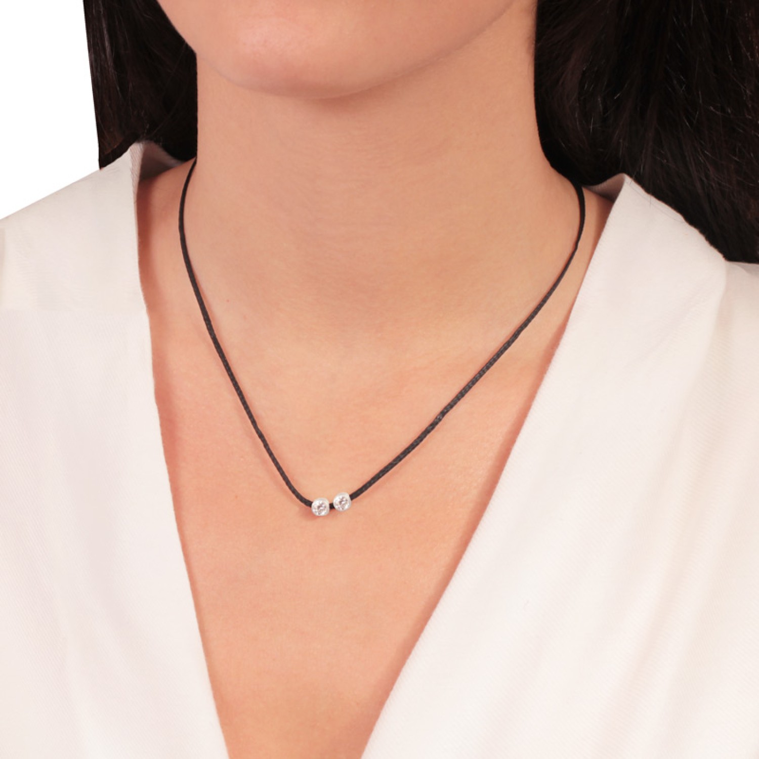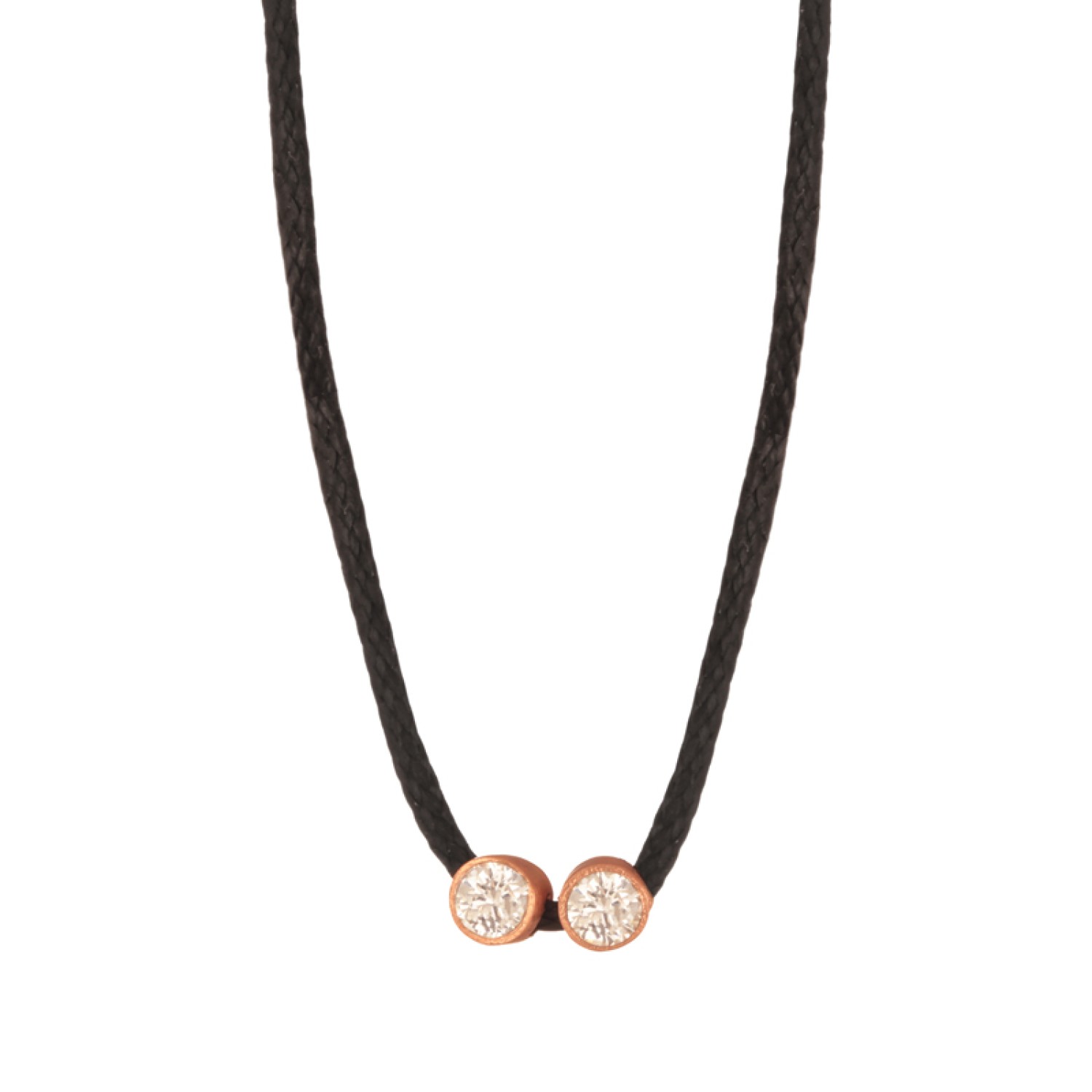 Γυναικείο κολιέ μαύρο κορδόνι με ασημένια 925 ρόζ επιχρυσωμένα περαστά δυο Μονόπετρα στολισμένα με λευκά ζιργκόν. Ένα χειροποίητο κόσμημα με λάμψη που θα φορέσετε παντοτινά. Υπογραμμίστε με casual chic στύλ κάθε εμφάνιση, μαγνητίζοντας όλα τα βλέμματα θαυμασμού. Ενώ το μέγεθος και το σχήμα του είναι ιδανικό για να το συνδυάσετε με άλλα για fashion layered look. Μια εξαιρετική επιλογή και για ενα προσωπικό δώρο με προσιτή τιμή και πολυτέλεια. Επιλέξτε το χρώμα που επιθυμείτε.