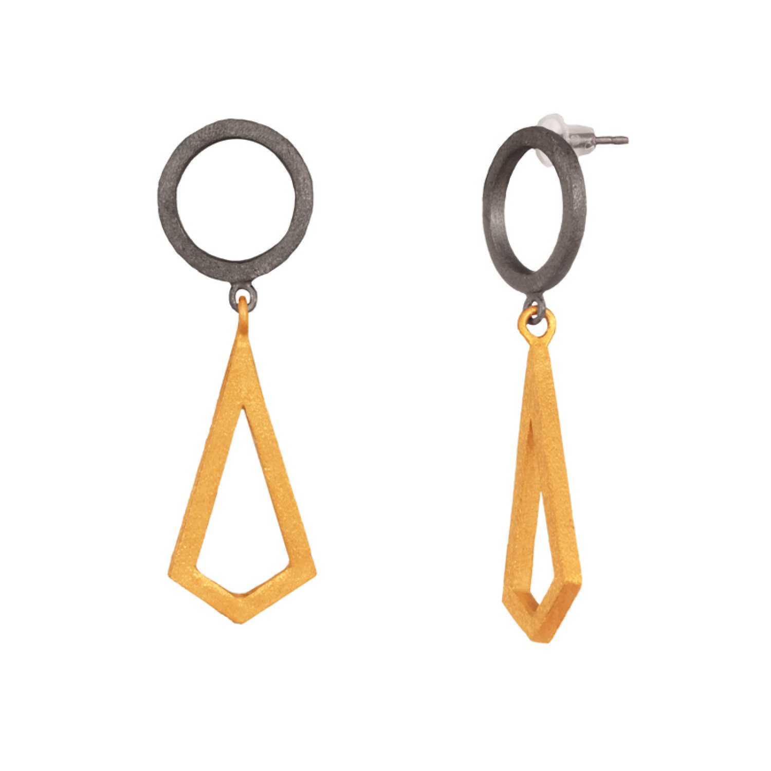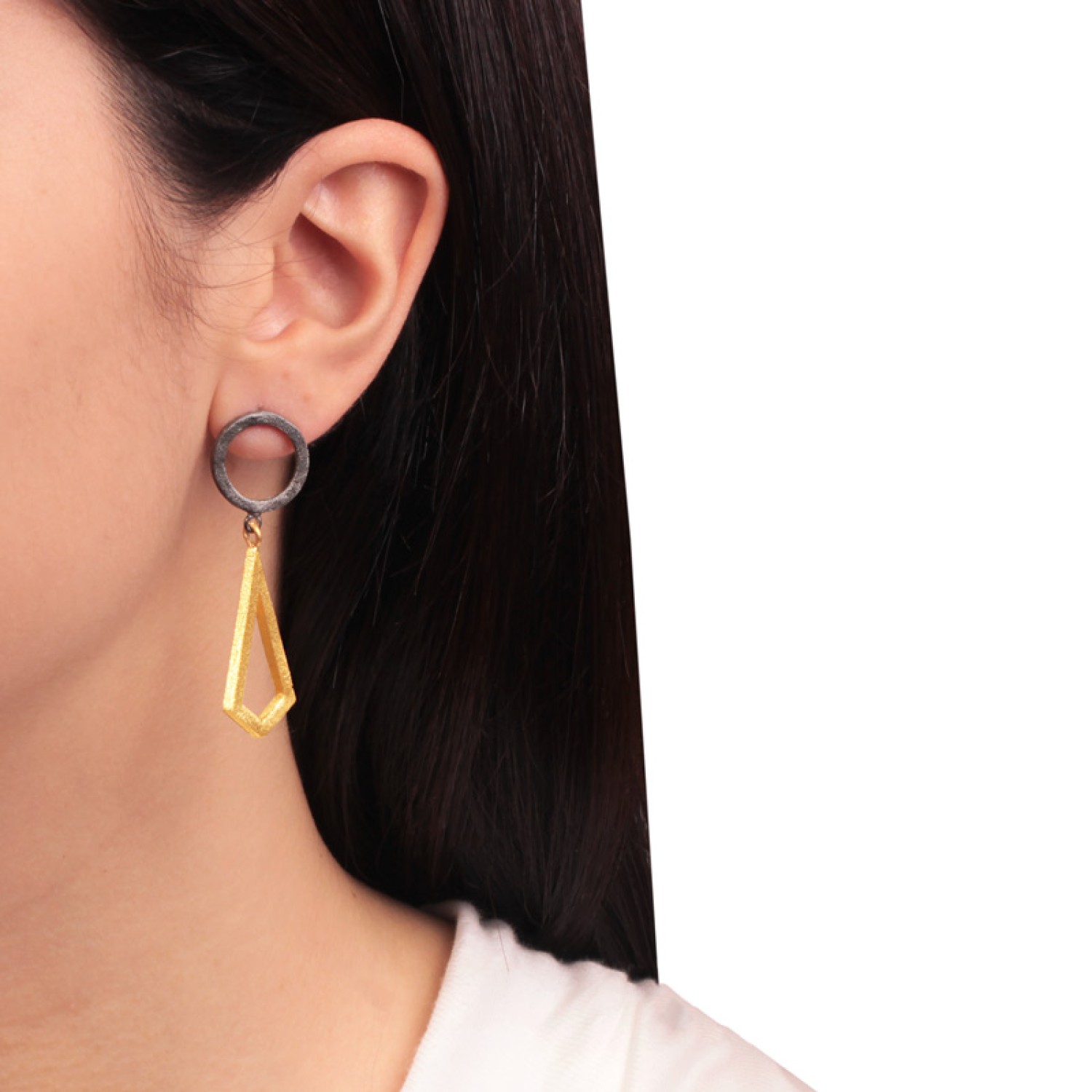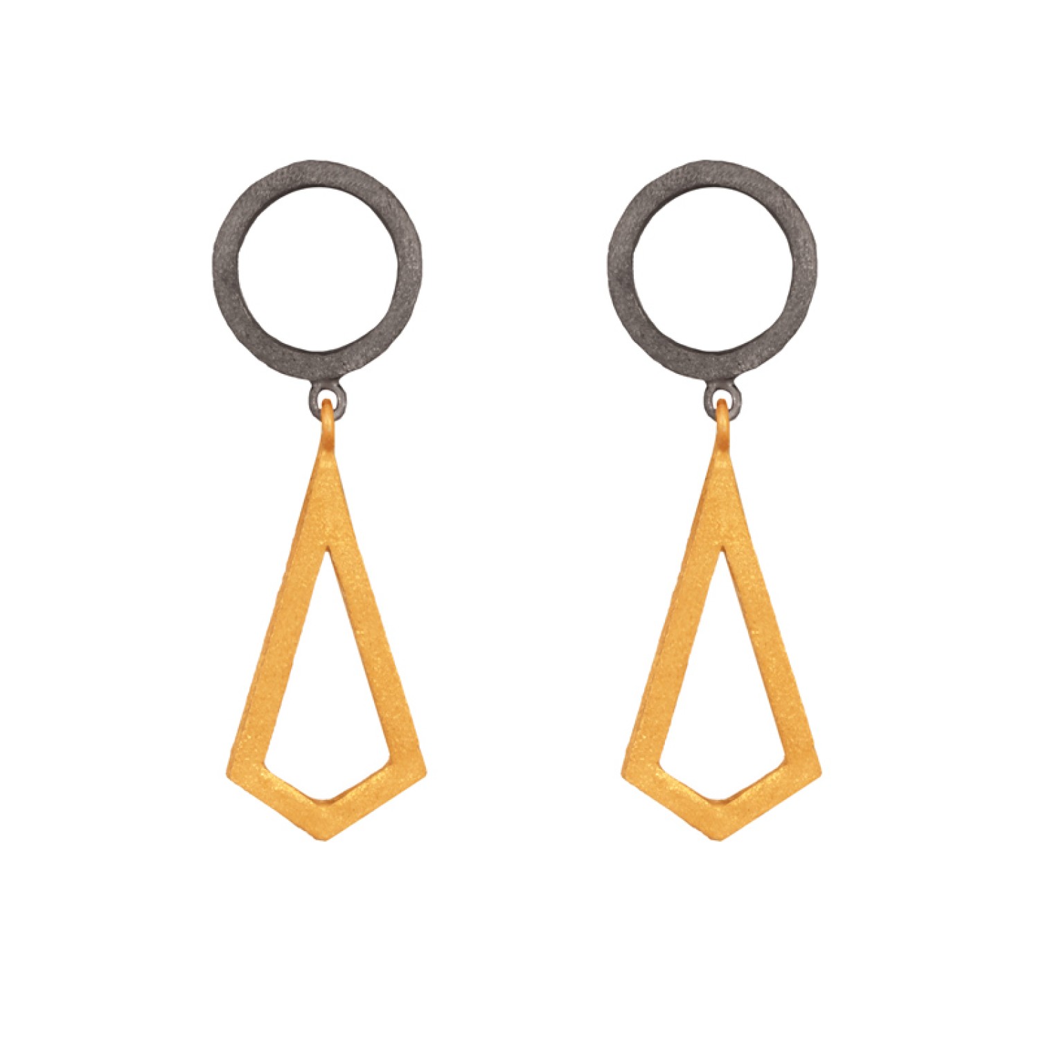Γυναικεία ορειχάλκινα καρφωτά σκουλαρίκια μαύροι επιπλατινωμένοι Κύκλοι με επίχρυσα Τρίγωνα. Εμπνευσμένο απο την Γεωμετρία αυτο το ζευγάρι θα χαρίσει minimal chic στύλ σε κάθε εμφάνιση. Το μάτ φινίρισμα αναδεικνύει το σχέδιο ενω η αρθωτή κίνηση αντανακλά λάμψη με κάθε σας κίνηση. Το εντυπωσιακό μέγεθος υπόσχεται να πρωταγωνιστήσει σε κάθε σύνολο μαγνητίζοντας όλα τα βλέμματα θαυμασμού. Μια εξαιρετική επιλογή και για ενα προσωπικό δώρο με προσιτή τιμή και πολυτέλεια.