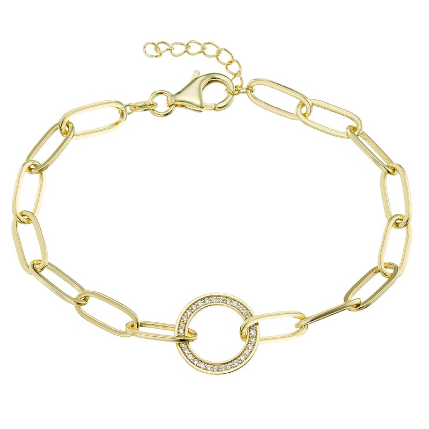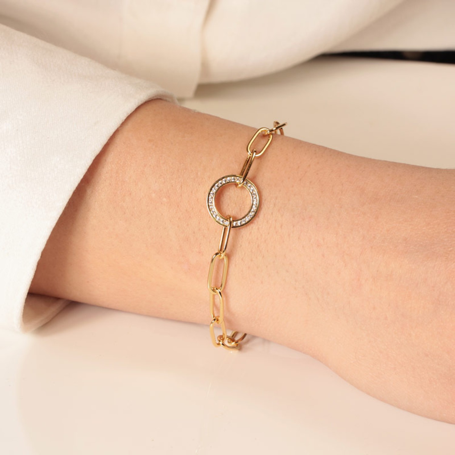 Γυναικείο ασημένιο 925 επίχρυσο σε 18 καράτια χρυσό βραχιόλι Αλυσίδα οβάλ Κρίκοι με Κύκλο. Το κεντρικό μοτίφ είναι στολισμένο με λευκά ζιργκόν να αντανακλούν λάμψη με κάθε σας κίνηση. Σίγουρα ενα εντυπωσιακό κόσμημα που θα χαρίσει luxe chic στύλ σε κάθε εμφάνιση. Ιδανική επιλογή για εσάς ή για ενα προσωπικό δώρο με πολυτέλεια