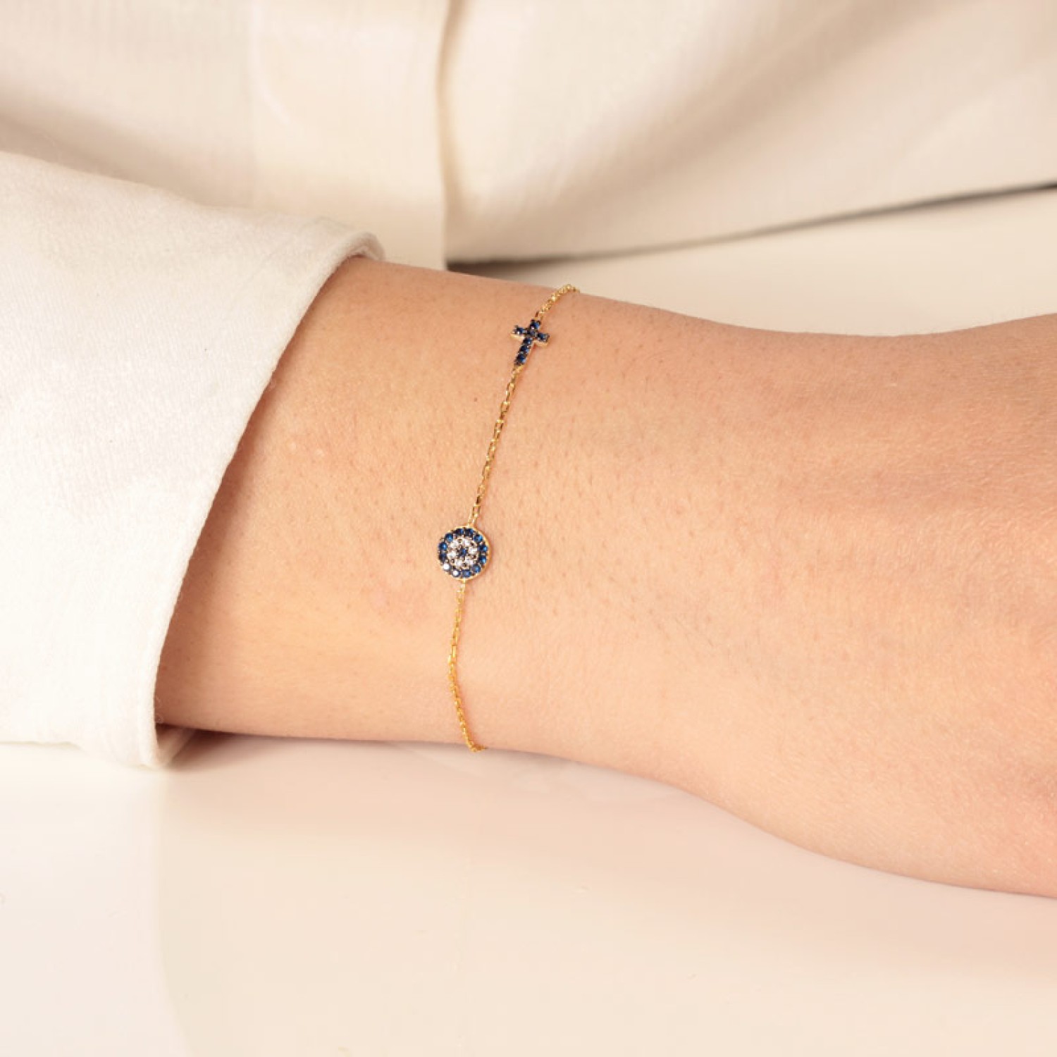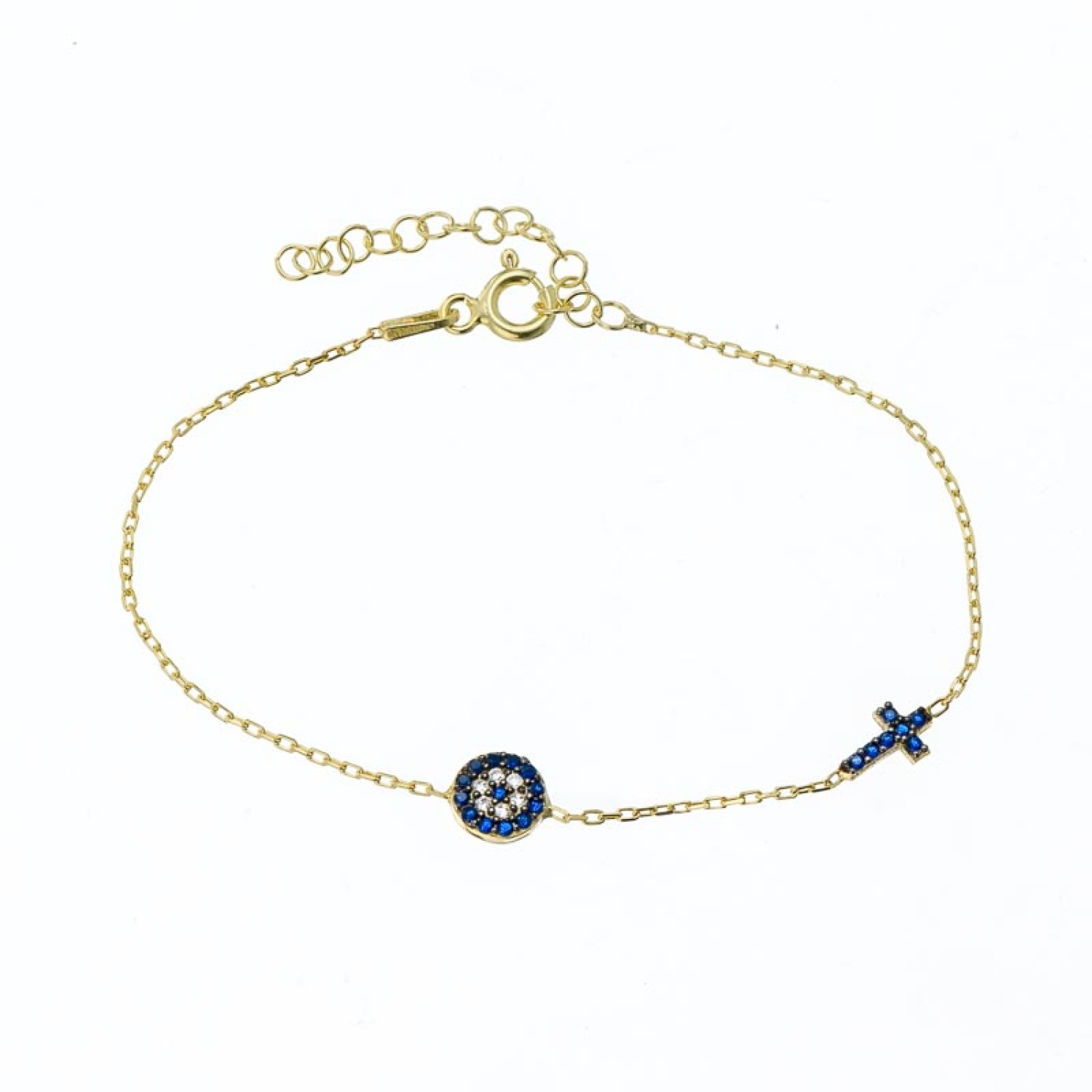 Γυναικείο ασημένιο 925 επίχρυσο σε 18 καράτια χρυσό βραχιόλι mini Μάτι Στόχος με καρφωμένα μπλέ και λευκά ζιργκόν και Σταυρό πλαγίως στην αλυσίδα. Η έντονη διχρωμία των ζιργκόν προσδίδει πολυτέλεια και λάμψη. Ενα κλασσικό σύμβολο Τύχης και Προστασίας σε κομψή έκδοση, ιδανικό για καθημερινές εμφανίσεις. Η αλυσίδα χεριού διαθέτει προέκταση κρίκους για να το προσαρμόσετε στον καρπό σας και να το συνδυάσετε. Εξαιρετική επιλογή και για ενα διαχρονικό δώρο με προσιτή τιμή και πολυτέλεια.