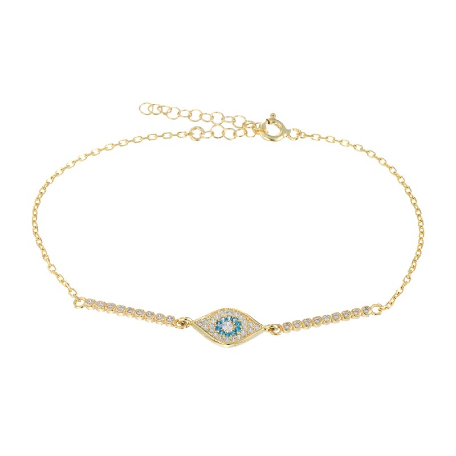 Γυναικείο ασημένιο επίχρυσο σε 18k χρυσό βραχιόλι Μάτι tennis Ριβιέρα. Ενα υπέροχο κόσμημα που συνδυάζει δυο αγαπημένα σχέδια. Το καλότυχο σύμβολο με το κλασσικό κόσμημα κάθε γυναίκας. Λαμπερό και εντυπωσιακό θα το αγαπήσετε και δεν θα το αποχωριστείτε λεπτό. Το κομψό μέγεθος είναι ιδανικό να το συνδυάσετε και με άλλα για ενα fashion arm party. Διαθέτει προέκταση κρίκους για να το προσαρμόσετε στον καρπό σας. Μια εξαιρετική επιλογή για εσάς ή για ενα προσωπικό δώρο με πολυτέλεια.