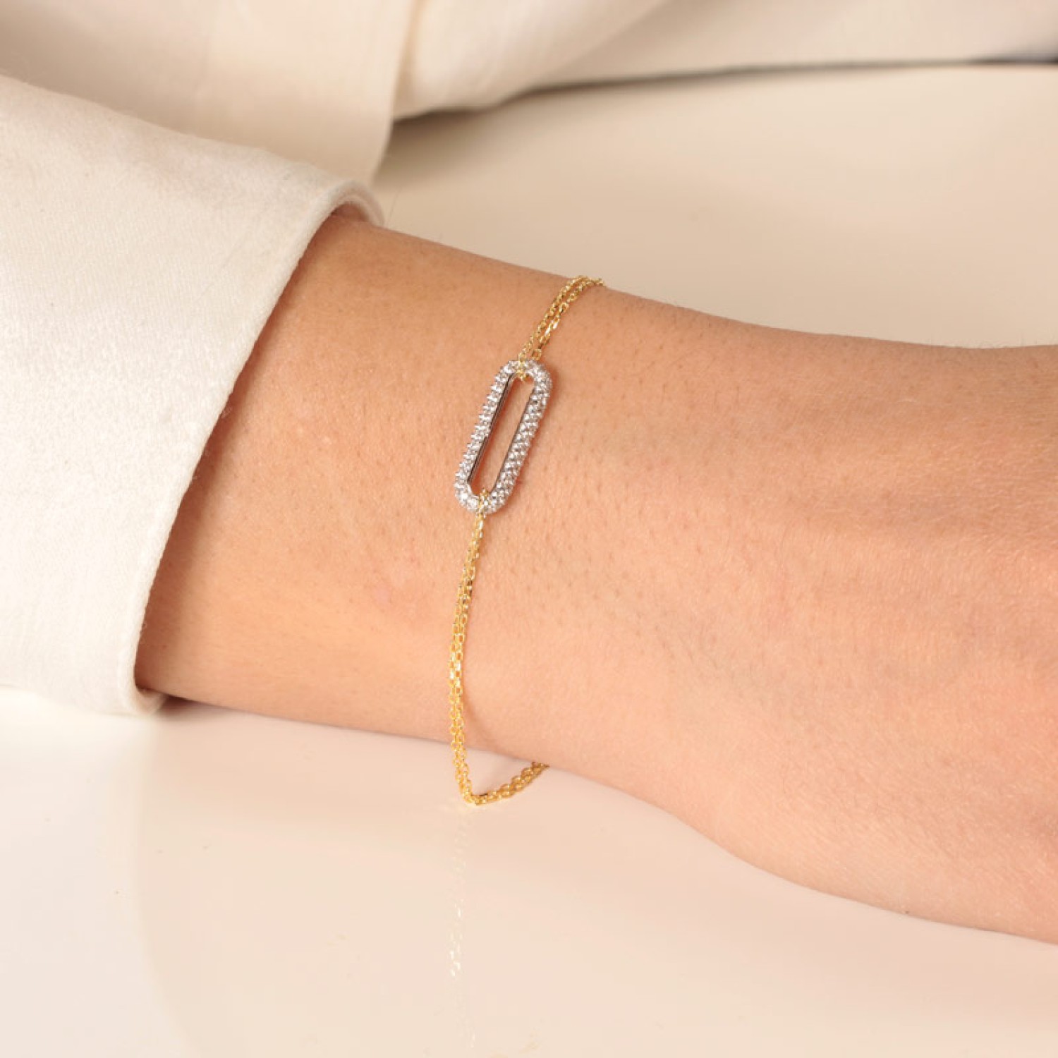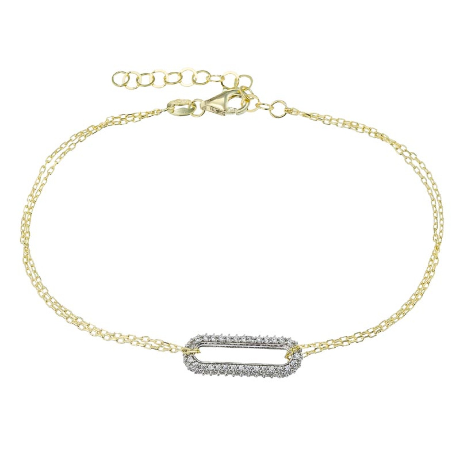 Γυναικείο ασημένιο 925 επίχρυσο βραχιόλι δυο σειρές Αλυσίδες με επιπλατινωμένο κέντρο Οβάλ Κρίκο. Το περίτεχνο σχέδιο αναδεικνύεται με pave καρφωμένα λευκά ζιργκόν να προσδίδουν πολυτέλεια. Ενα κομψό κόσμημα που συνδυάζει φίνο σχέδιο και chic στύλ. Η διχρωμία το κάνει ιδανικό για κάθε εμφάνιση και στιγμή. Διαθέτει προέκταση κρίκους για να το προσαρμόσετε στον καρπό σας. Προτείνουμε να το χαρίσετε και ως ενα διαχρονικό δώρο που θα κλέψει τις εντυπώσεις,
