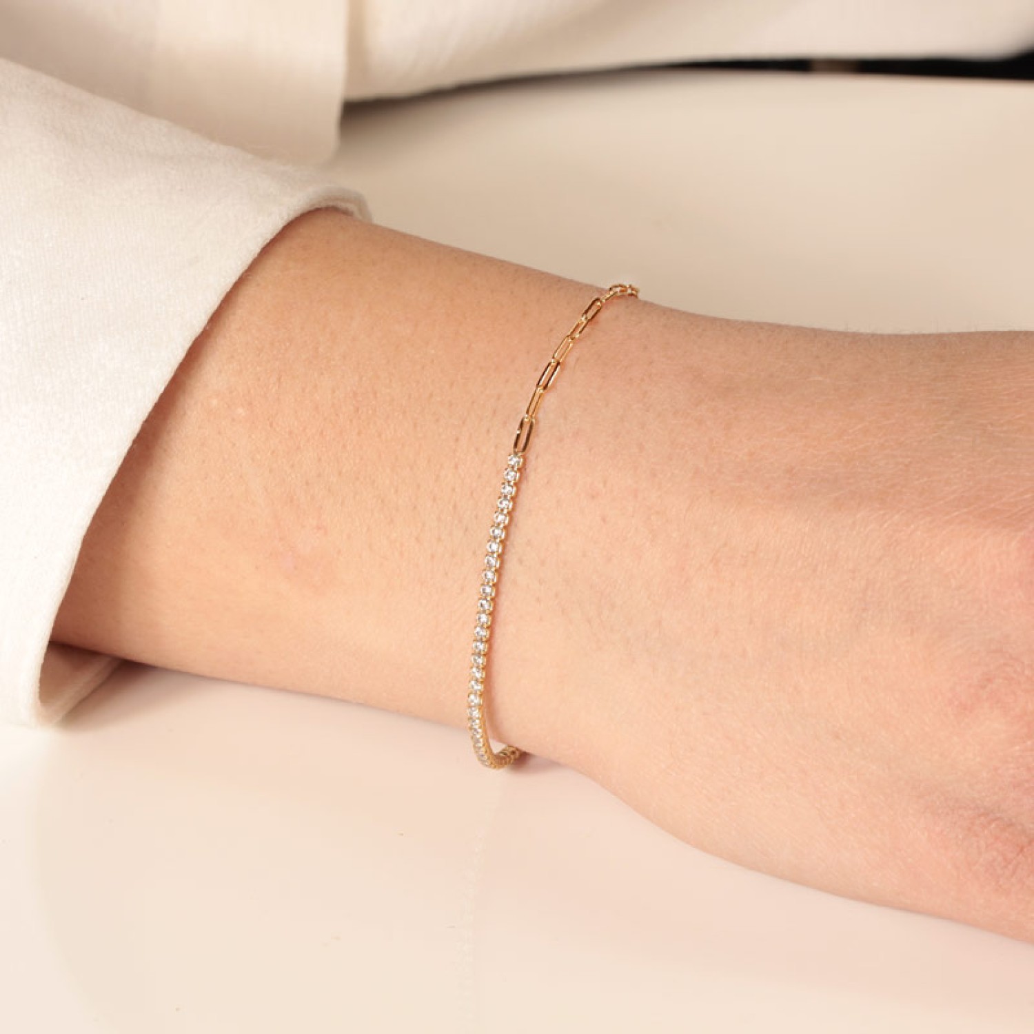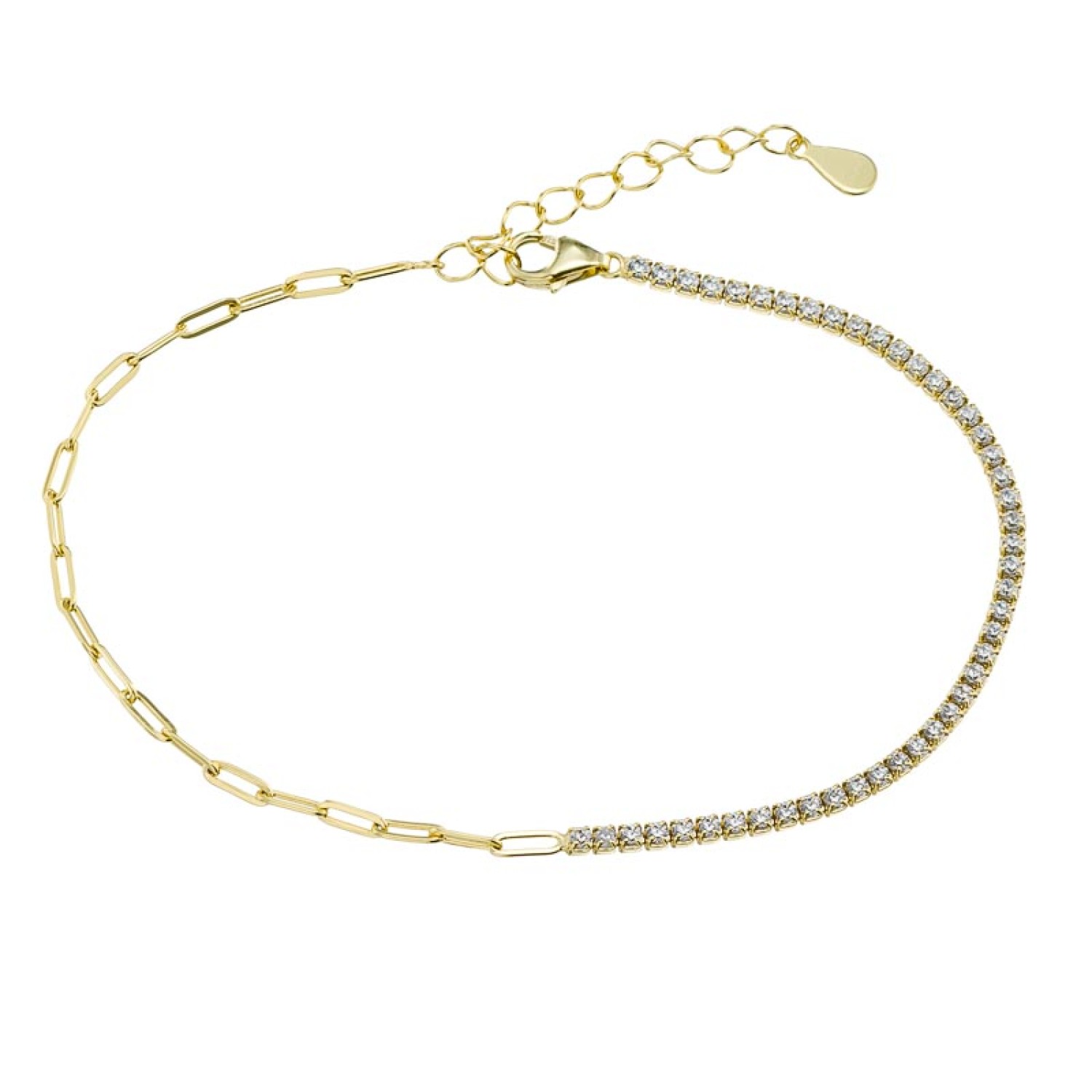 Γυναικείο ασημένιο 925 επίχρυσο σε 18 καράτια χρυσό βραχιόλι Σέτ Αλυσίδα Ριβιέρα στολισμένη με λευκά ζιργκόν. Ενα υπέροχο κόσμημα που συνδυάζει κομψότητα και διαχρονικότητα. Θα στολίσει τον καρπό σας αντανακλώντας απαράμιλλη λάμψη με κάθε σας κίνηση. Διαθέτει προέκταση κρίκους για να το προσαρμόσετε και να το συνδυάσετε και με αλλα για ενα fashion arm party.