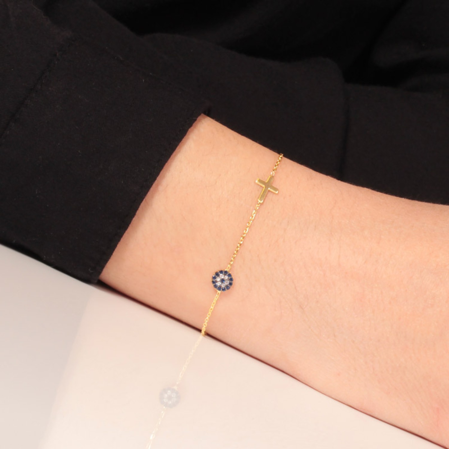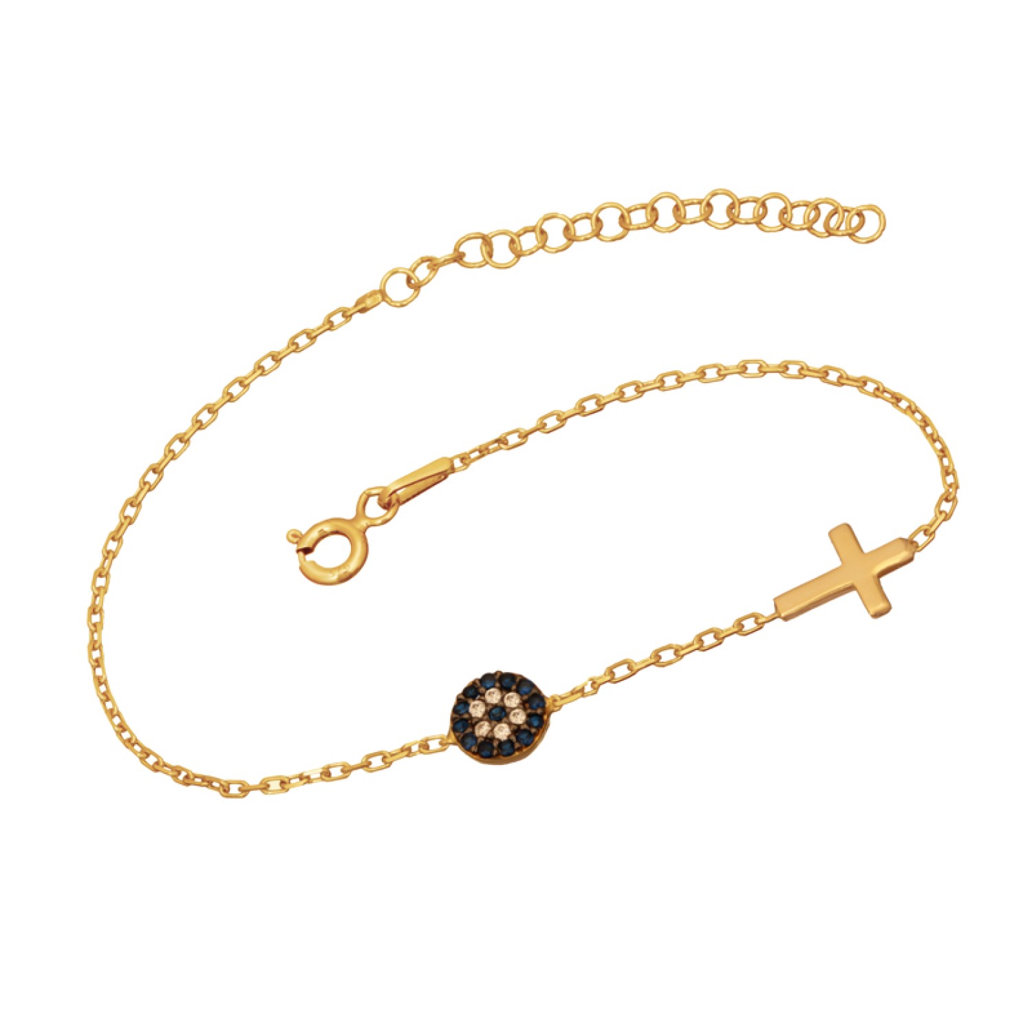 Γυναικείο ασημένιο 925 επίχρυσο σε 14k χρυσό βραχιόλι Αλυσίδα με Μάτι Στόχο και Σταυρό. Το αγαπημένο σύμβολο Τύχης είναι στολισμένο με pave καρφωμένα μπλέ και λευκά ζιργκόν να δημιουργούν το εντυπωσιακό εφέ που μαγνητίζει. Ενα καλότυχο κόσμημα που θα γίνει το αγαπημένο σας φυλαχτό για κάθε ημέρα. Μια εξαιρετική επιλογή και για ενα προσωπικό δώρο με προσιτή τιμή και πολυτέλεια. Διαθέτει προέκταση κρίκους για να το προσαρμόσετε στον καρπό σας.