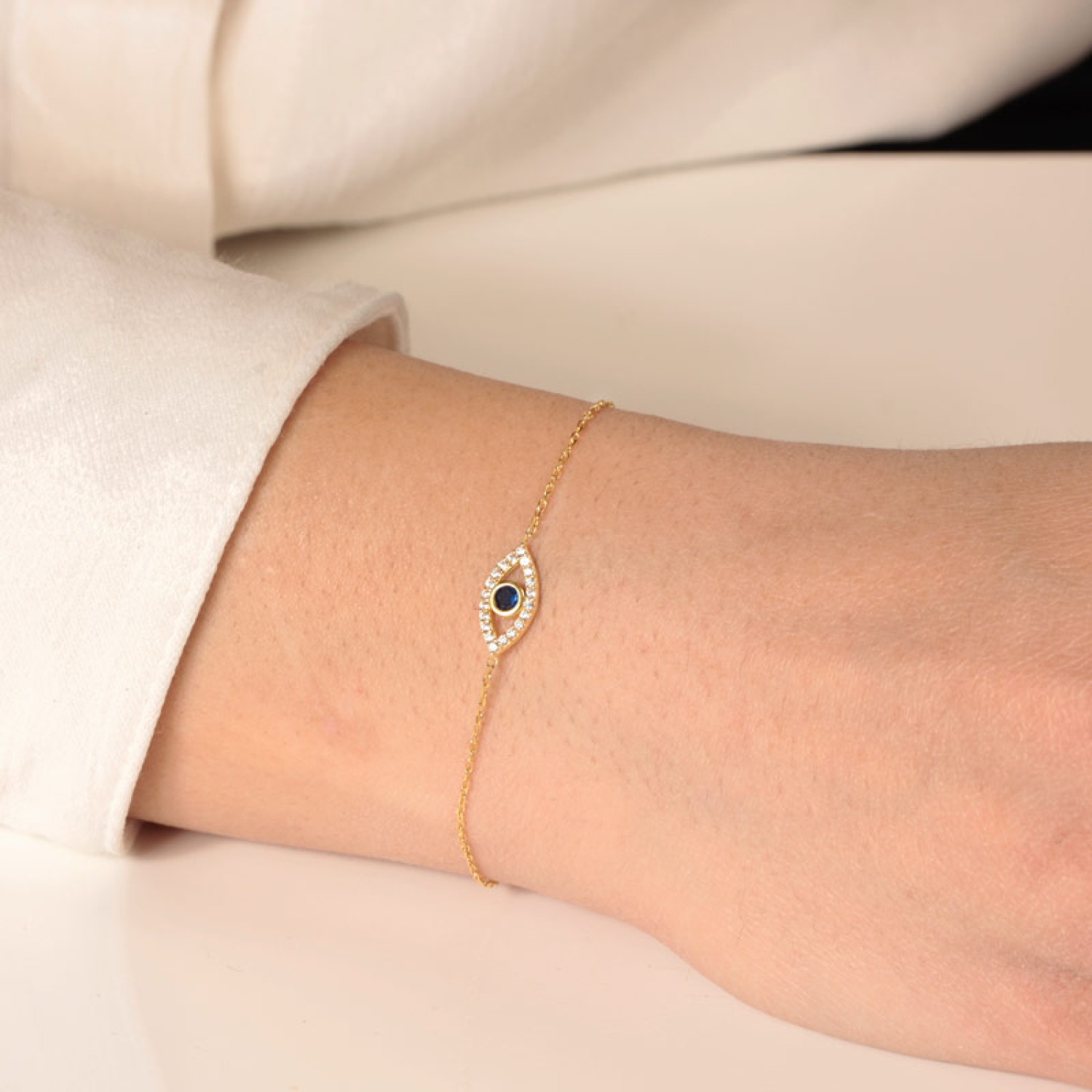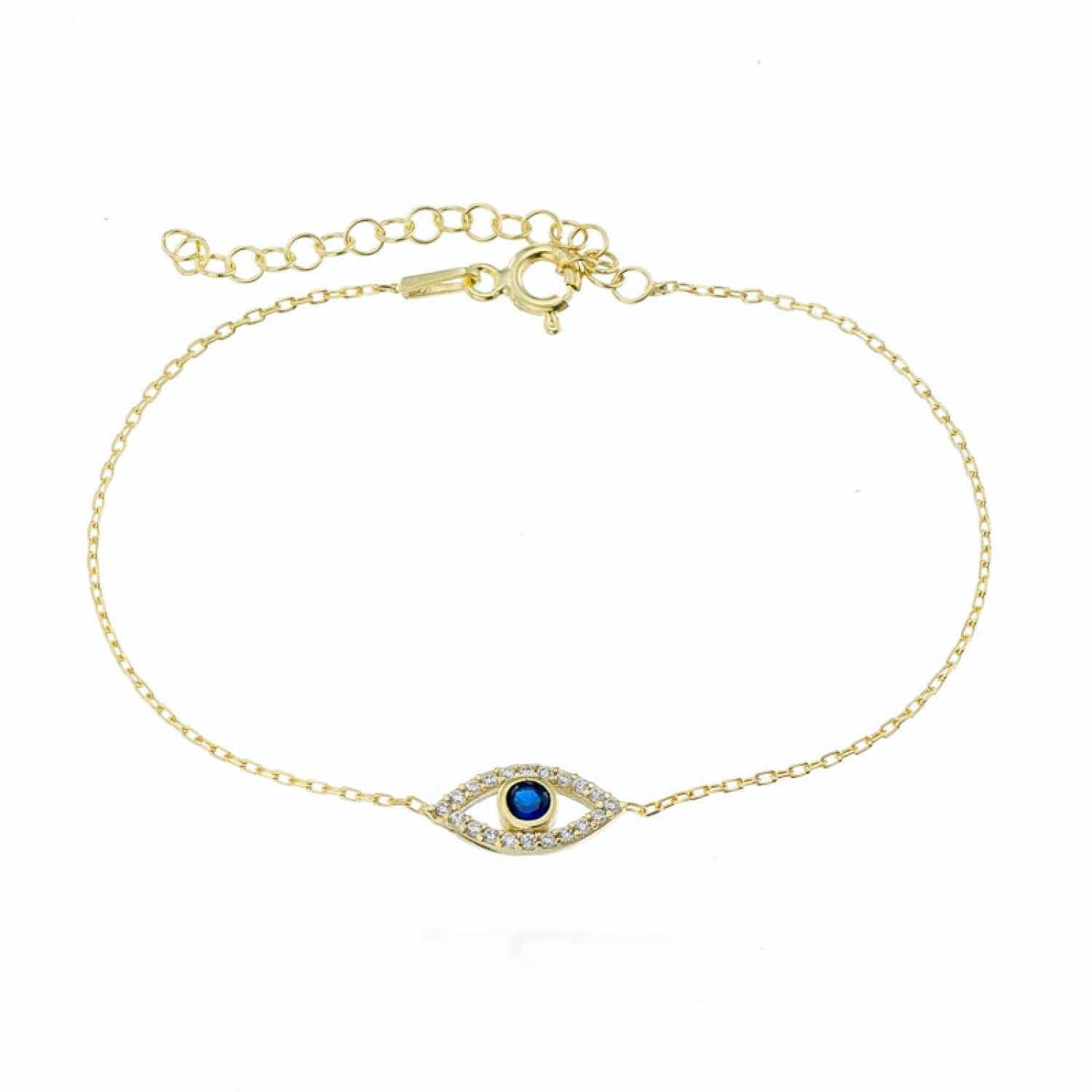 Γυναικείο ασημένιο 925 επίχρυσο σε 18 καράτια χρυσό βραχιόλι Μάτι, στολισμένο περιμμετρικά με λευκά και κέντρο μπλέ ζιργκόν. Το πιο αγαπημένο σύμβολο Τύχης και Προστασίας σε πολυτελής έκδοση. Κομψό και λαμπερό θα γίνει το αγαπημένο σας φυλαχτό. Η αλυσίδα διαθέτει προέκταση κρίκους για να το προσαρμόσετε στον καρπό σας και να μην το αποχωριστείτε λεπτό.
