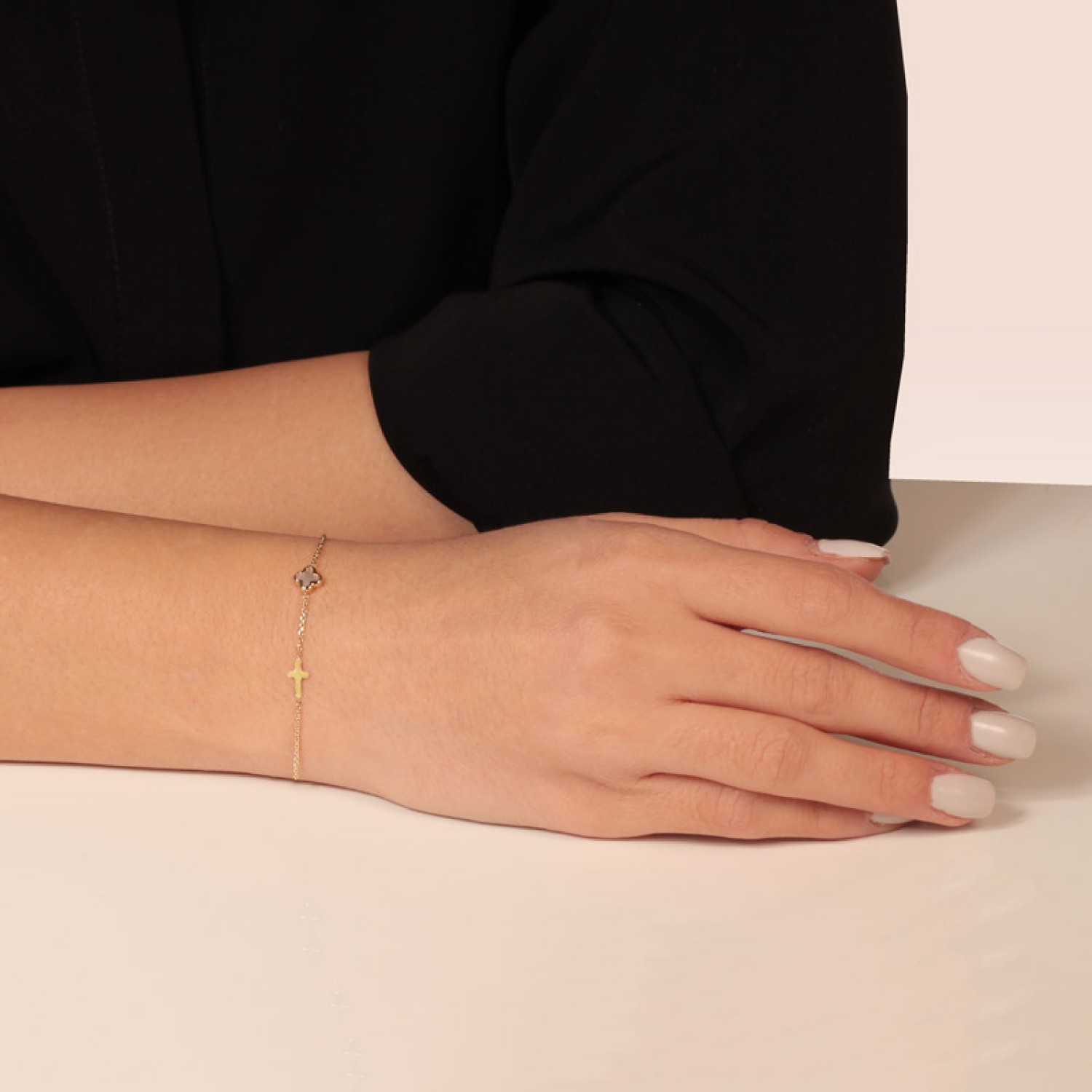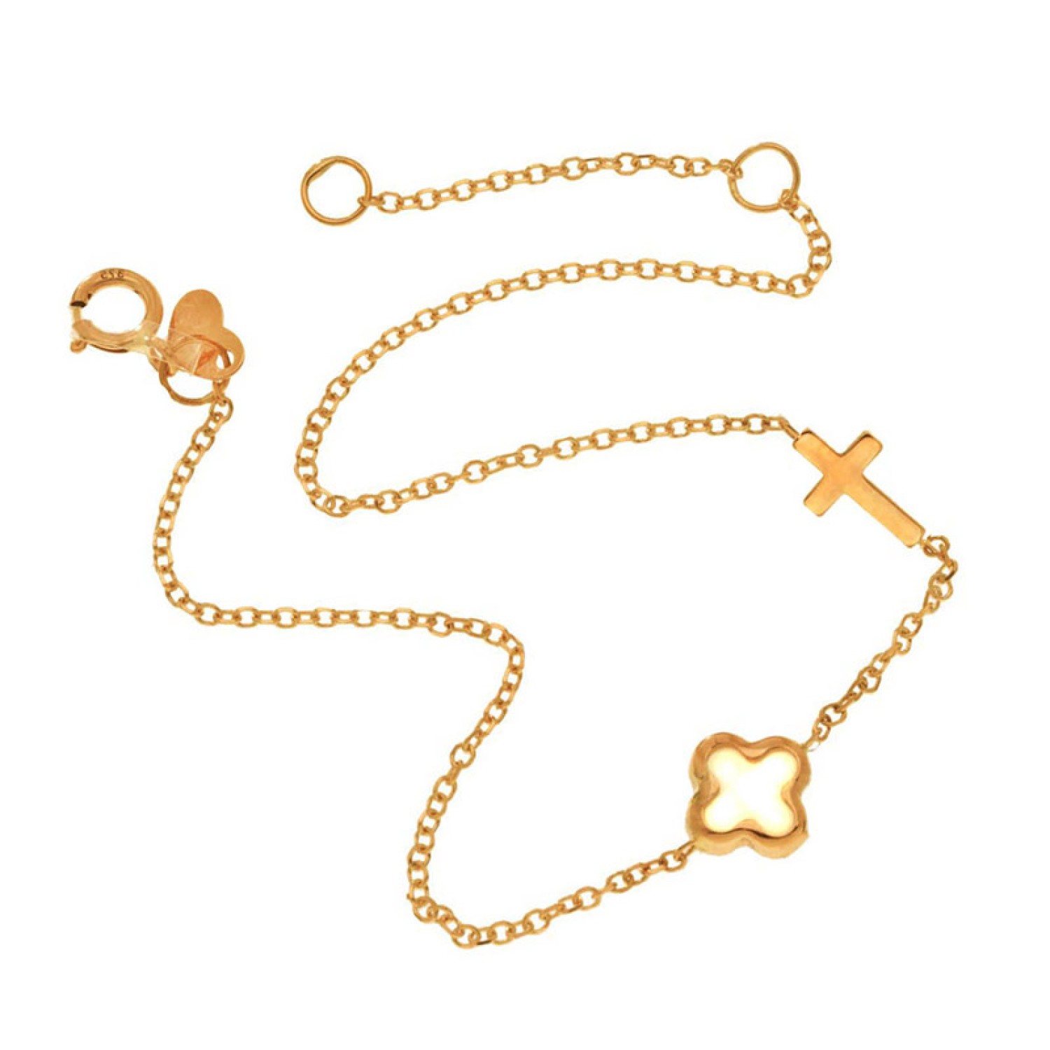 Γυναικείο χρυσό 9 καράτια χρυσό βραχιόλι αλυσίδα με δύο Σταυρούς. Στολισμένος ο Τετράφυλλος με λευκό Φίλντισι μαγνητίζει το φώς και αντανακλά υπέροχους ιριδιζμούς με κάθε κίνηση. Το κλασσικό σύμβολο της Ορθοδοξίας σε κομψή έκδοση. Αξίζει να αποκτήσετε αυτο το παντοτινό θησαυρό με συναισθηματική αξία. Θα χαρίσει λάμψη και θα γίνει το αγαπημένο φυλαχτό σας. Στο κούμπωμα πρωταγωνιστεί μια μινι Καρδιά που θα ερωτευτείτε με την πρώτη ματιά. Μια εξαιρετική επιλογή και για ενα διαχρονικό δώρο Βάπτησις με πολυτέλεια. Διαθέτει ενδιάμεσο κρίκο για να το προσαρμόσετε στον καρπό σας.