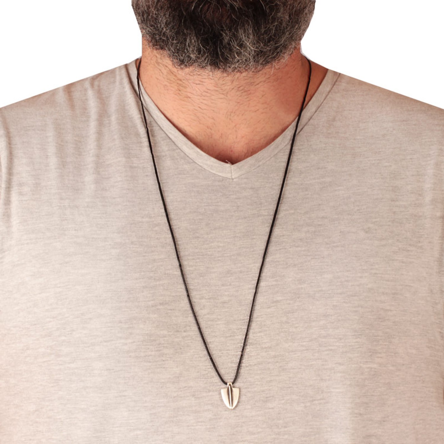 Αντρικό κολιέ μαύρο κορδόνι με ασημένιο 925 επιπλατινωμένο μενταγιόν Ασπίδα. Το υπέροχο κρεμαστό είναι χειροποιήτα φιλοτεχνημένο με οξείδωση που αναδεικνύει το περίτεχνο σχέδιο. Απόλυτα συμβολικό και δυναμικό, υπόσχεται να μαγνητίσει και να πρωταγωνιστήσει σε κάθε rock look. Φορέστε το μόνο του ή συνδυάστε το με άλλα παρόμοια και σίγουρα θα κλέψετε τις εντυπώσεις. Προτείνουμε να το χαρίσετε και ως ενα προσωπικό δώρο με πολυτέλεια και στύλ.