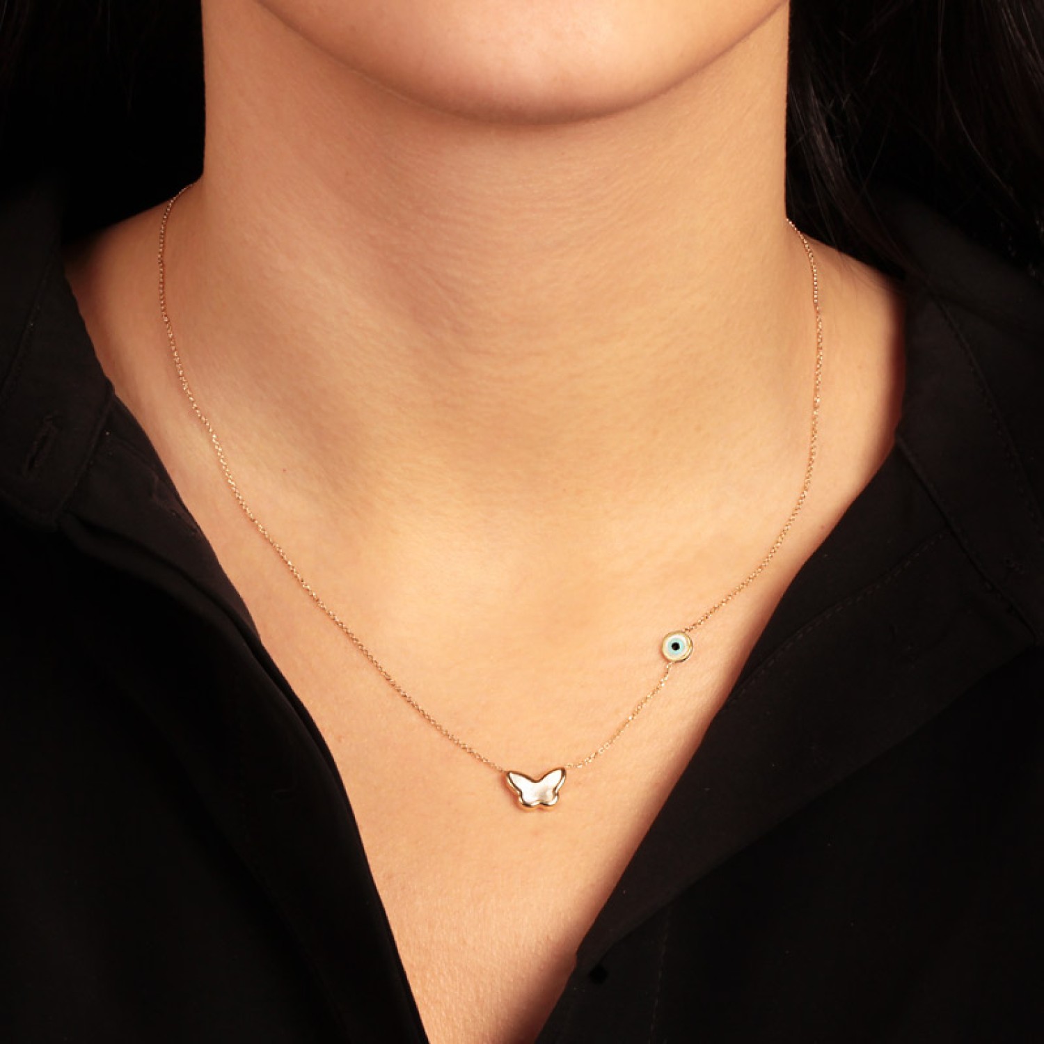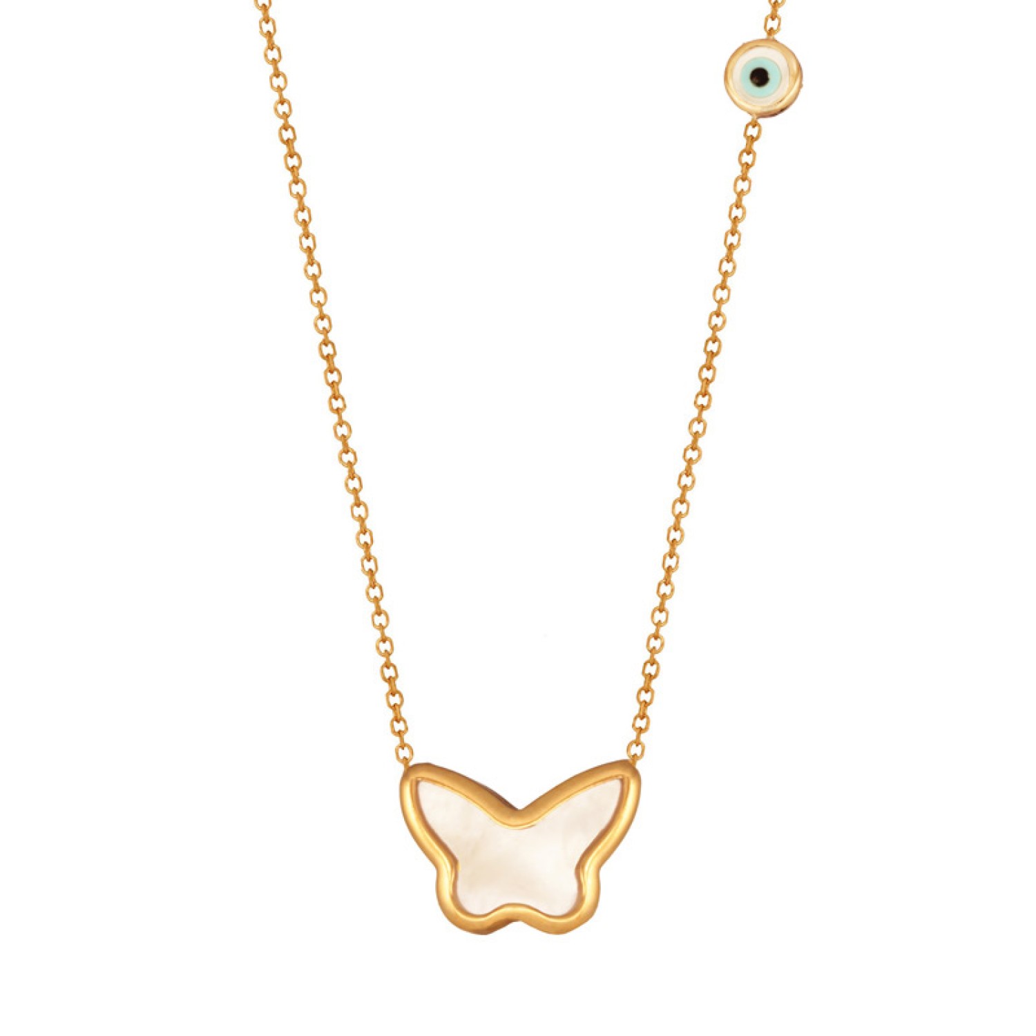 Γυναικείο χρυσό 9 καράτια κολιέ μενταγιόν Πεταλούδα με κέντρο λευκό Φίλντισι. Το φίνο σύνολο συμπληρώνει ενα Μάτι να χαρίζει χρώμα στην αλυσίδα. Ενα συμβολικό κόσμημα που θα χαρίσει μια παιχνιδιαρική νότα σε κάθε chic εμφάνιση. Λαμπερό και κομψό, υπόσχεται να σας στολίσει μαγνητίζοντας ολα τα βλέμματα θαυμασμού. Μια εξαιρετική επιλογή που θα φορέσετε διαχρονικά και αξίζει μια θέση στην συλλογή σας.