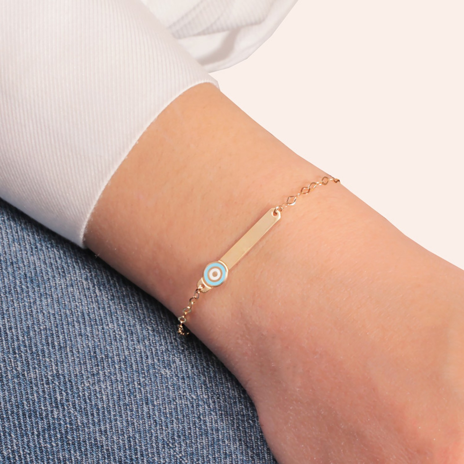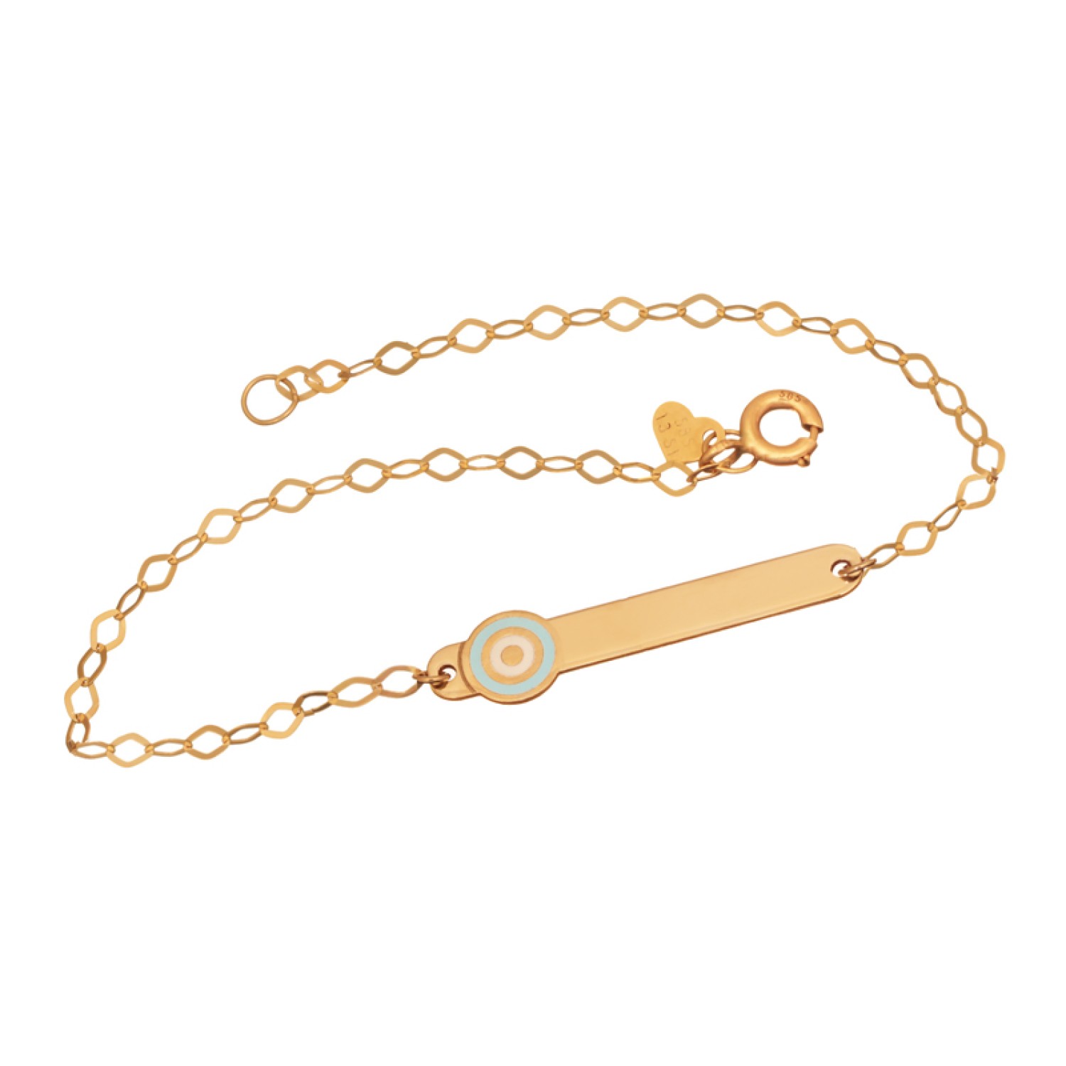 Παιδικό χρυσό 9 καράτια βραχιόλι Αλυσίδα με πλακέτα Ταυτότητα. Το φίνο σύνολο συμπληρώνει ενα καλότυχο Μάτι να χαρίζει περίτεχνη λεπτομέρεια. Αυτο είναι το πρώτο και παντοτινό κόσμημα του παιδιού σας. Κατόπιν παραγγελίας χαράζουμε Όνομα ή Αρχικά. Ενα εντυπωσιακό δώρο με αγαπημένο συμβολισμό Προστασίας και θετικής Ενέργειας. Μια εξαιρετική επιλογή με αληθινή και συναισθηματική αξία, ιδανική για να χρυσώσετε ενα μωρό για Γέννηση ή για ενα προσωποιημένο δώρο Βάπτισης. Διαθέτει κρίκους για να το προσαρμόσετε στον καρπό.