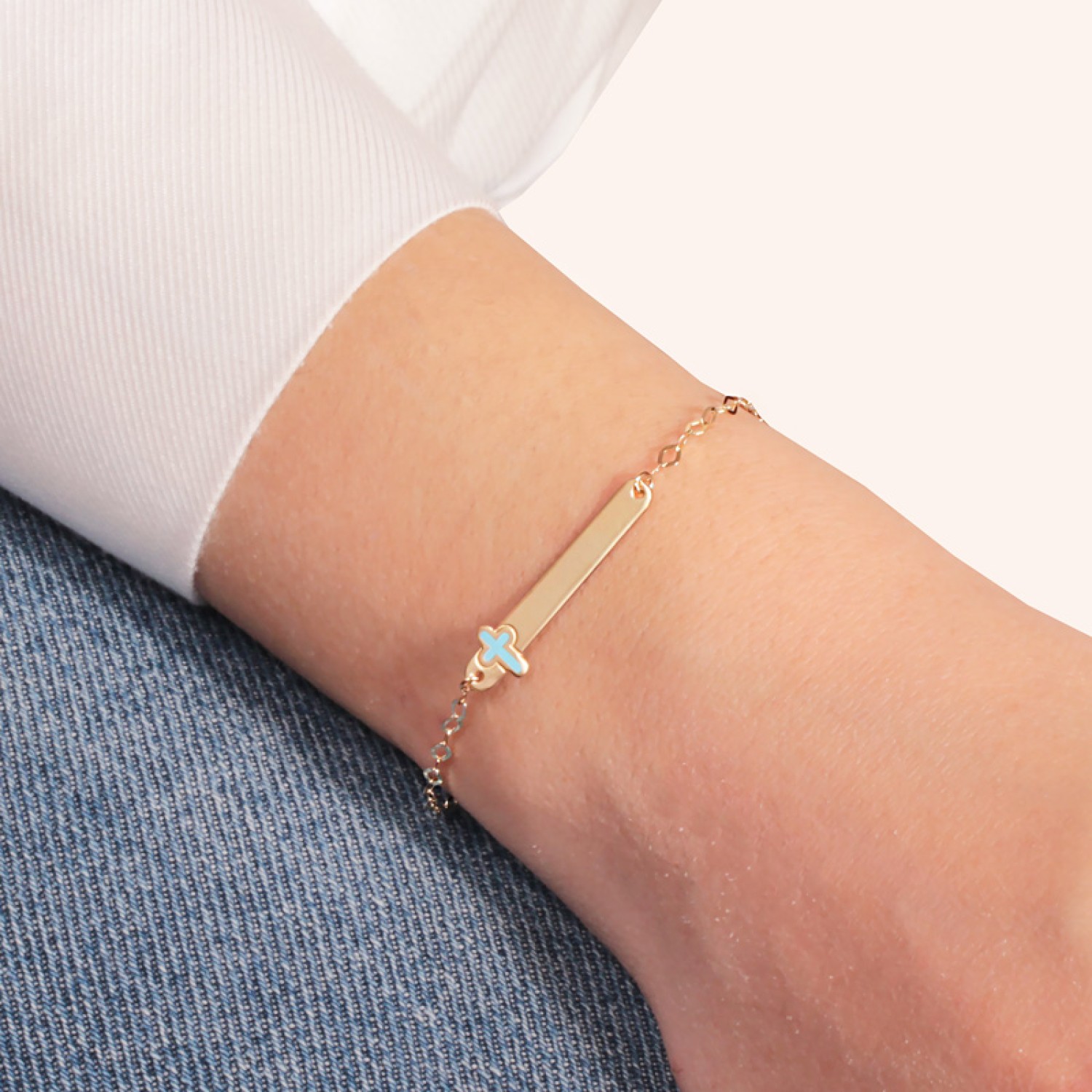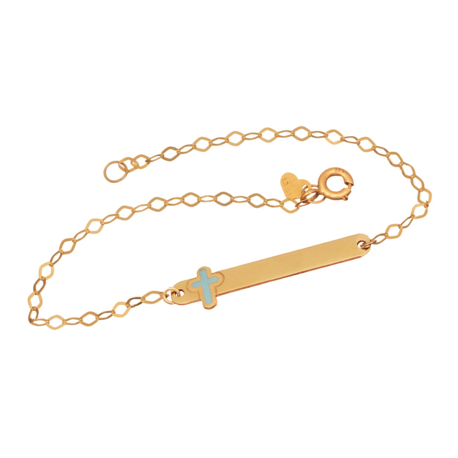 Παιδικό χρυσό 9 καράτια βραχιόλι Αλυσίδα με πλακέτα Ταυτότητα. Το φίνο σύνολο συμπληρώνει ενα καλότυχος Σταυρός να χαρίζει περίτεχνη λεπτομέρεια. Αυτο είναι το πρώτο και παντοτινό κόσμημα του παιδιού σας. Κατόπιν παραγγελίας χαράζουμε Όνομα ή Αρχικά. Ενα εντυπωσιακό δώρο με αγαπημένο συμβολισμό Προστασίας και Πίστης. Μια εξαιρετική επιλογή με αληθινή και συναισθηματική αξία, ιδανική για να χρυσώσετε ενα μωρό για Γέννηση ή για ενα προσωποιημένο δώρο Βάπτισης. Διαθέτει κρίκους για να το προσαρμόσετε στον καρπό.