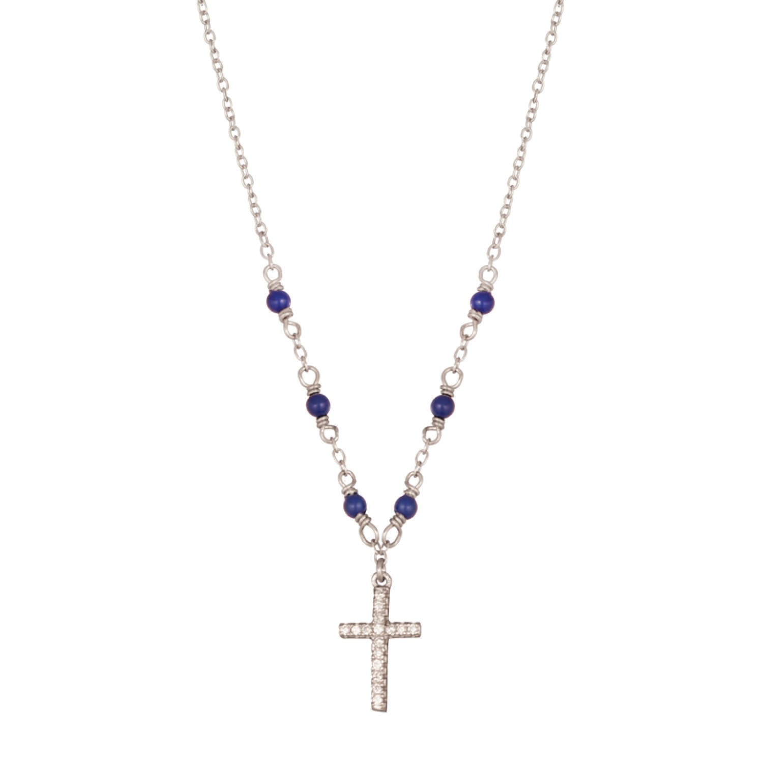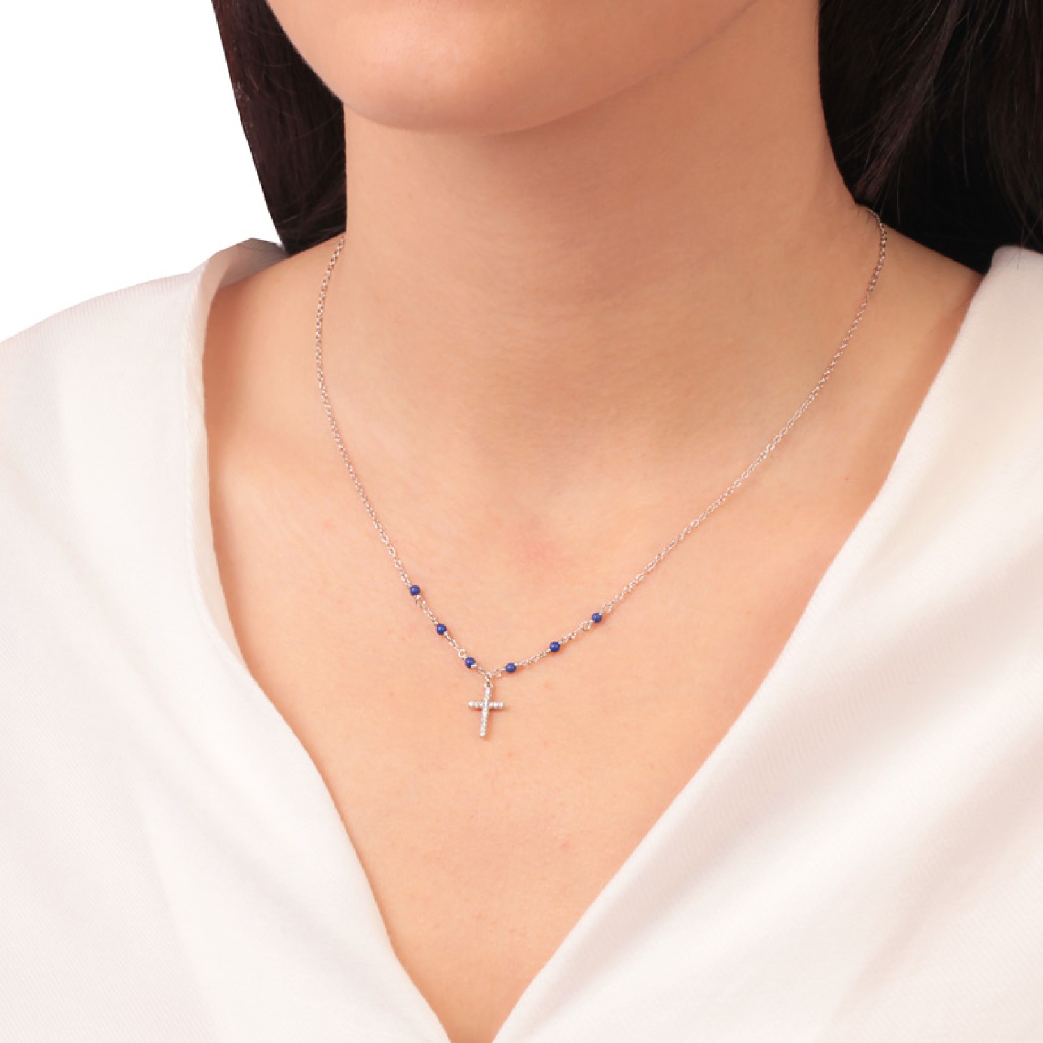 Γυναικείο ασημένιο 925 επιπλατινωμένο κολιέ Αλυσίδα με κρεμαστό Σταυρό pave καρφωμένα ζιργκόν. Το φίνο σύνολο αναδεικνύεται με Μπίλιες φιλοτεχνημένες με royal blue σμάλτο σαν ροζάριο. Συνδυάζει μοναδικό κομψότητα και στύλ ενω υπόσχεται να μαγνητίσει όλα τα βλέμματα θαυμασμού. Τόσο το μέγεθος όσο και το μήκος το κάνουν ιδανικό για να το συνδυάσετε με αλλα για fashion layered looks. Μια εξαιρετική επιλογή για εσάς ή για ενα προσωπικό δώρο με πολυτέλεια. Η αλυσίδα λαιμού διαθέτει προέκταση κρίκους για να το προσαρμόσετε στο ύψος που επιθυμείτε.