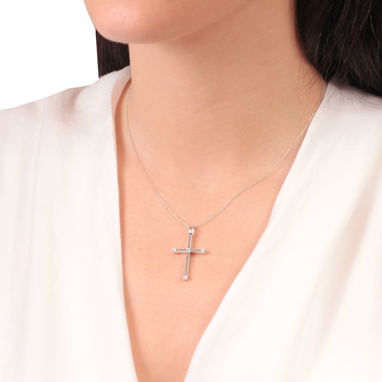 Γυναικείο λευκόχρυσο 14 καράτια κολιέ μενταγιόν Σταυρός. Το φίνο σύνολο αναδεικνύεται με brilliant cut ζιργκόν στο κέντρο και στις τρείς άκρες. Ενα κλασσικό σύμβολο Πιστης και Θρησκείας μας, σε ενα παντοτινό κόσμημα με σημασία στην πολυτέλεια. Συνδυάζει μοναδικό κομψότητα με διαχρονικότητα, στύλ και σχέδιο. Μια εξαιρετική επιλογή και για Βαπτιστικός, το πρώτο κόσμημα του Κοριτσιού σας αξίζει να είναι αυτό. Συνοδέψτε το με μια λευκόχρυση αλυσίδα για ενα ολοκληρωμένο look.