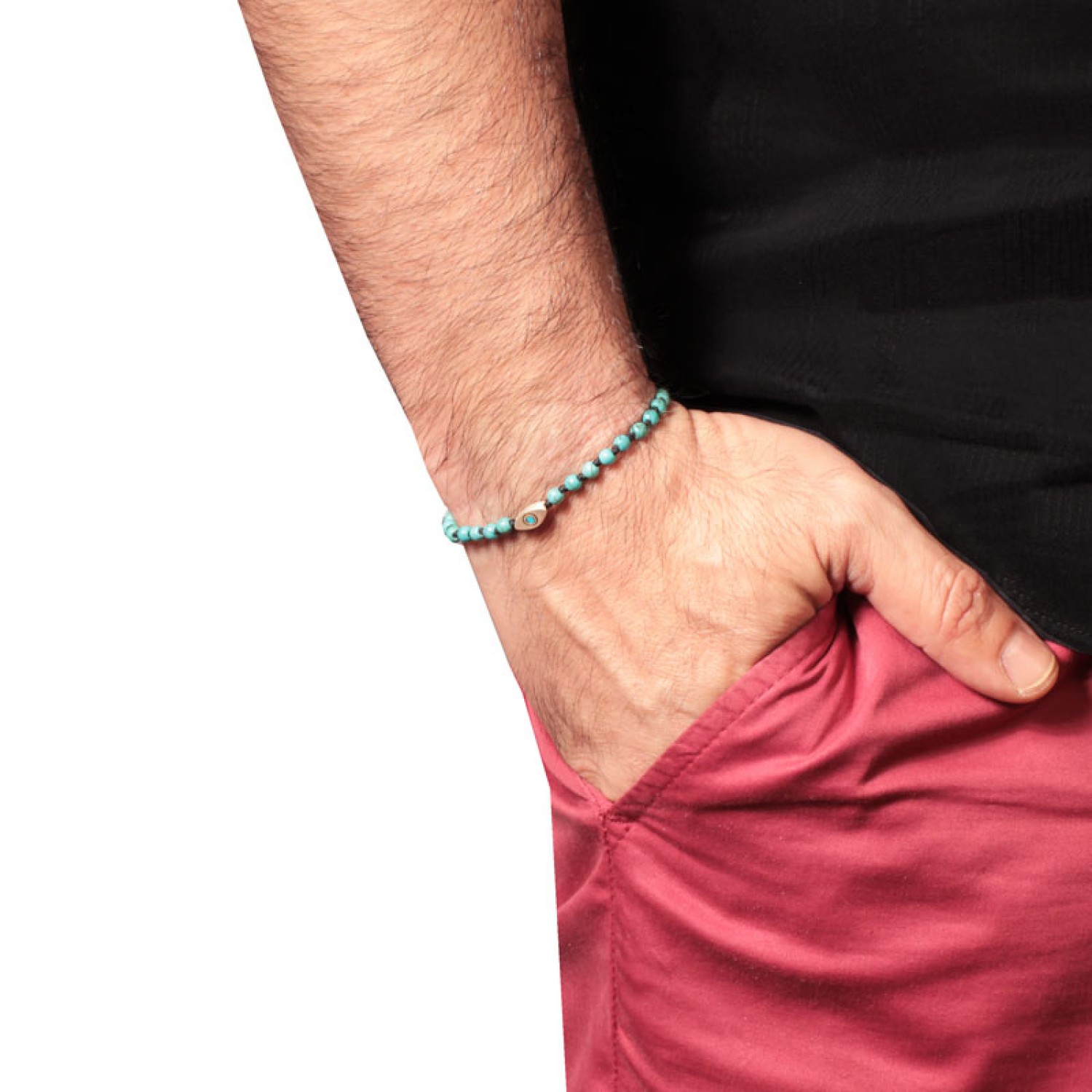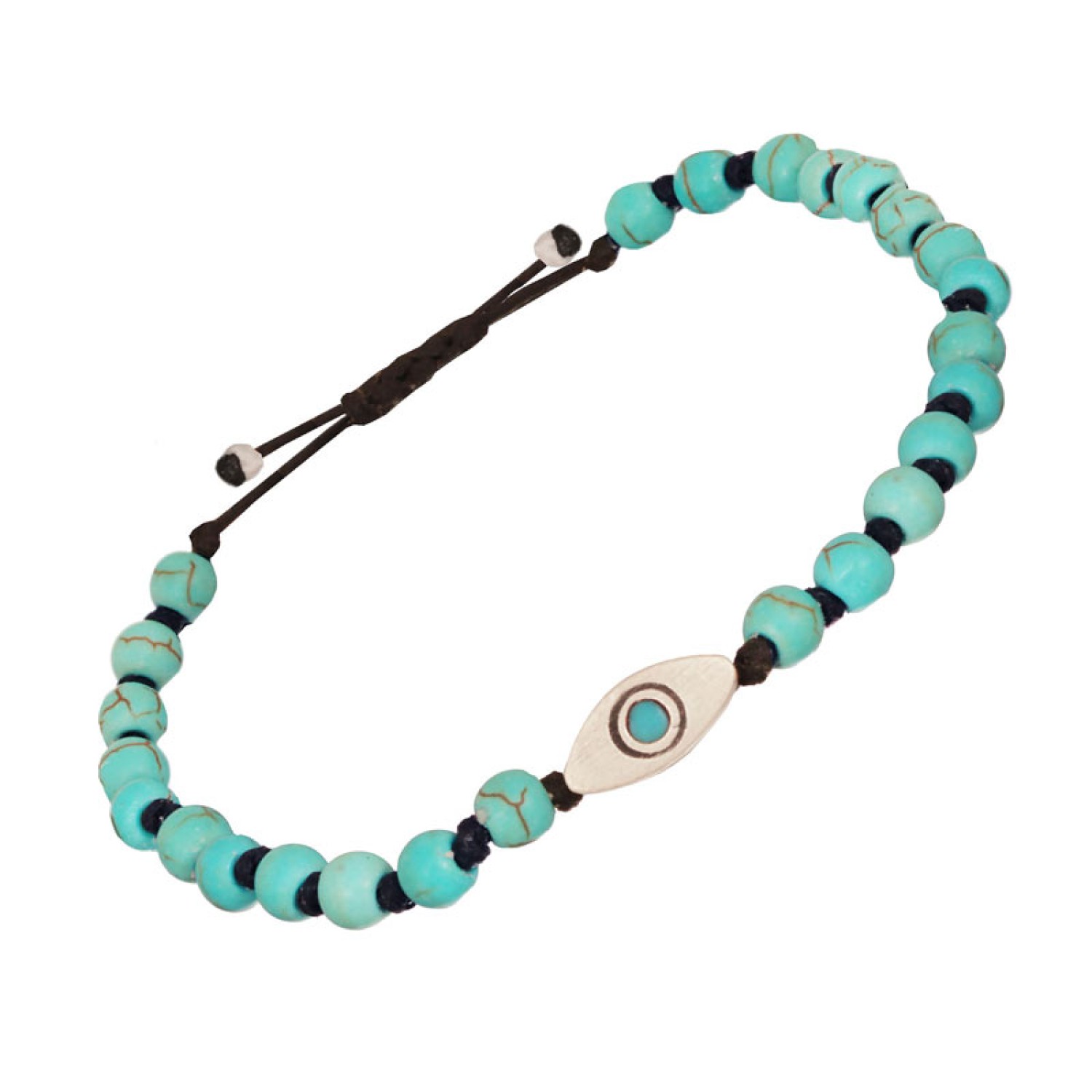 Ανδρικό βραχιόλι κορδόνι με πέτρες Τιρκουάζ Χαολίτη και ασημένιο 925 επιπλατινωμένο Μάτι με σμάλτο. Ενα χειροποιήτο κόσμημα που συνδυάζει καλότυχο συμβολισμό και boho στύλ. Το αγαπημένο φυλαχτό που θα υπογραμμίσει τις καθημερινές σας εμφανίσεις. Μια εξαιρετική επιλογή για εσάς ή για ενα προσωπικό δώρο με προσιτή τιμή και διαχρονικότητα. Διαθέτει macrame πλέξη κούμπωμα για να το προσαρμόσετε απόλυτα στον καρπό σας. Ολα τα υλικά και οι λίθοι είναι εξαιρετικής ποιότητας και αντοχής.