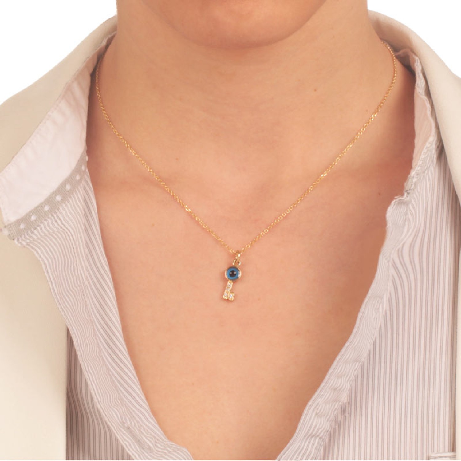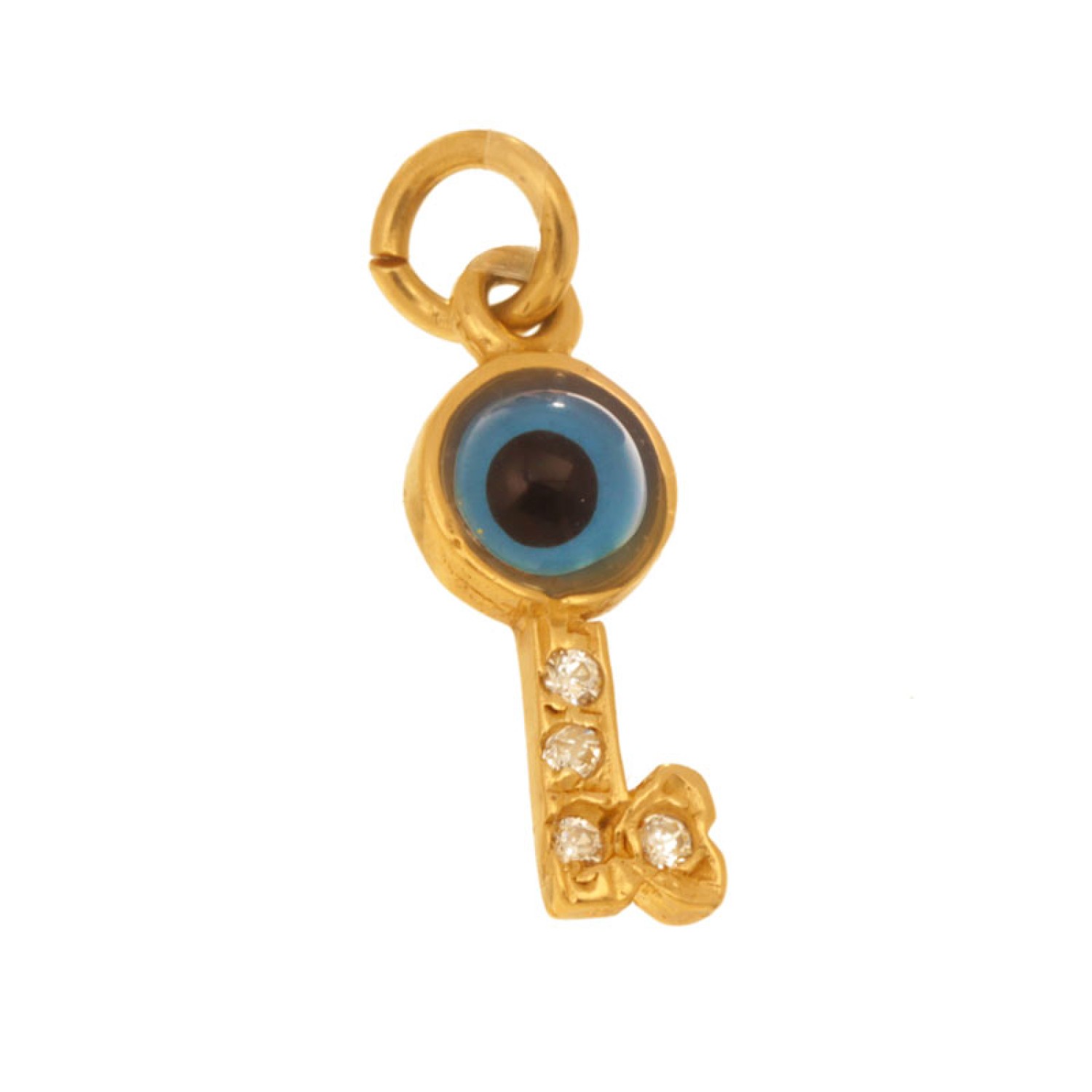 14 καράτια χρυσό μοτίφ Κλειδί Μάτι ζιργκόν. Ενα σύμβολο να κλειδώσει την καλοτυχία και το καλό μάτι. Φορέστε το με ένα κορδόνι λαιμού για ενα casual chic look.