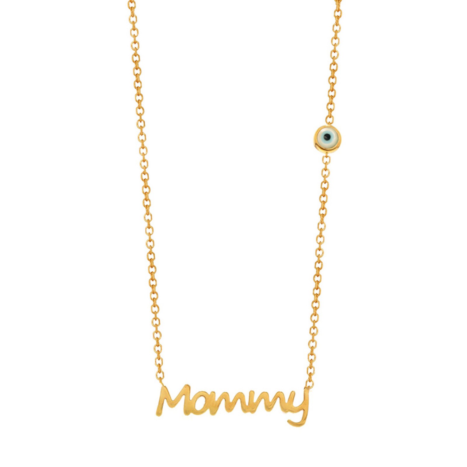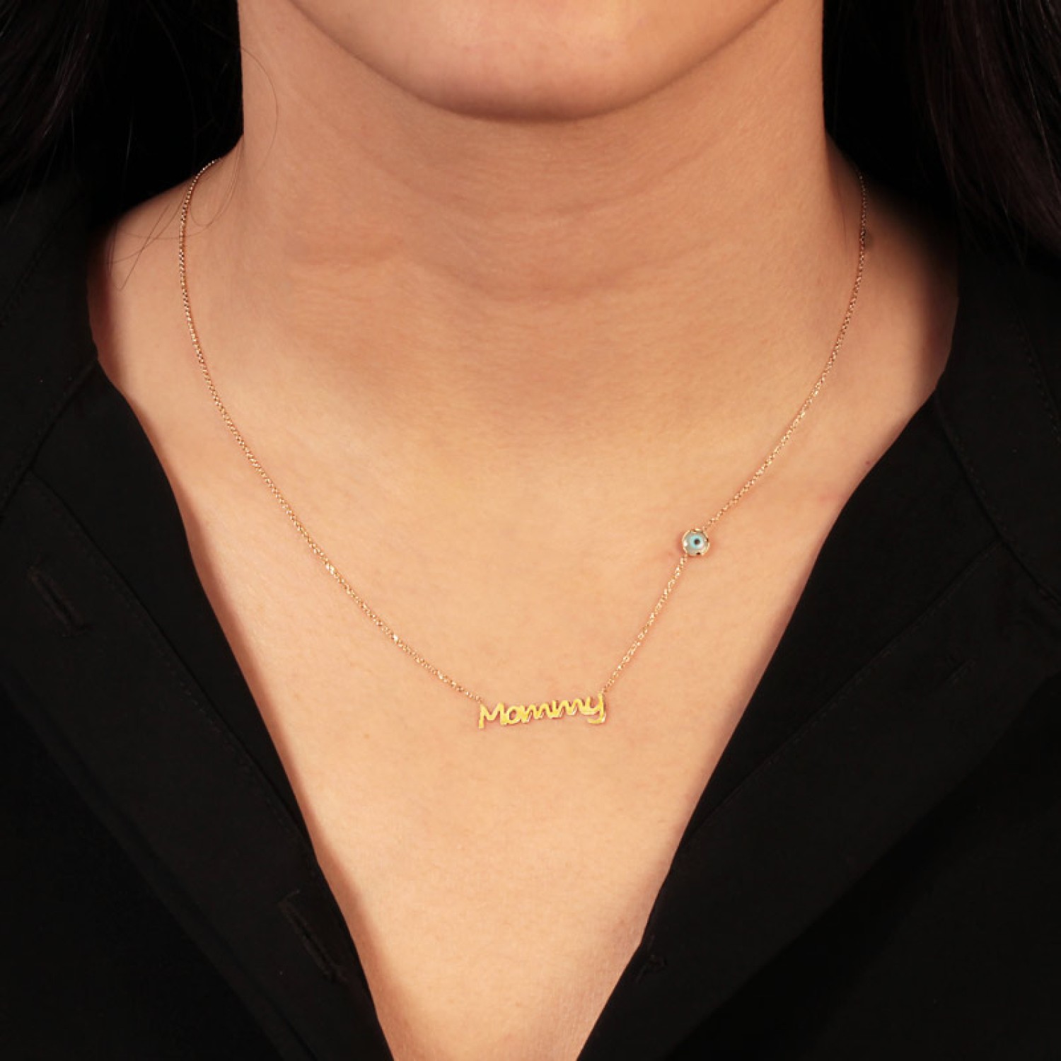 Γυναικείο χρυσό 9 καράτια κολιέ μενταγιόν Μαμά γραμμένο στα Αγγλικά, Mommy. Η φίνα αλυσίδα είναι στολισμένη με στρογγυλό Μάτι Φίλντισι για Τύχη και Προστασία. Χαρίστε λάμψη και λεπτομέρεια στις καθημερινές σας εμφανίσεις. Το πιο αγαπημένο μήνυμα σε ένα διαχρονικό θησαυρό που θα φοράτε για πάντα. Αξίζει να αποκτήσετε αυτο το παντοτινό φυλαχτό ανάμνησης της πιο ανιδιοτελής Αγάπης . Ιδανική επιλογή για όσες λατρεύουν το ρόλο της μαμάς και το αγγελούδι τους. Σας το προτείνουμε για ενα πολυτελής δώρο Γέννησης ή Βάπτησις που θα δημιουργήσει παντοτινές αναμνήσεις. Διαθέτει μια μινι Καρδιά στο κούμπωμα που προσδίδει αγαπημένο συμβολισμό.