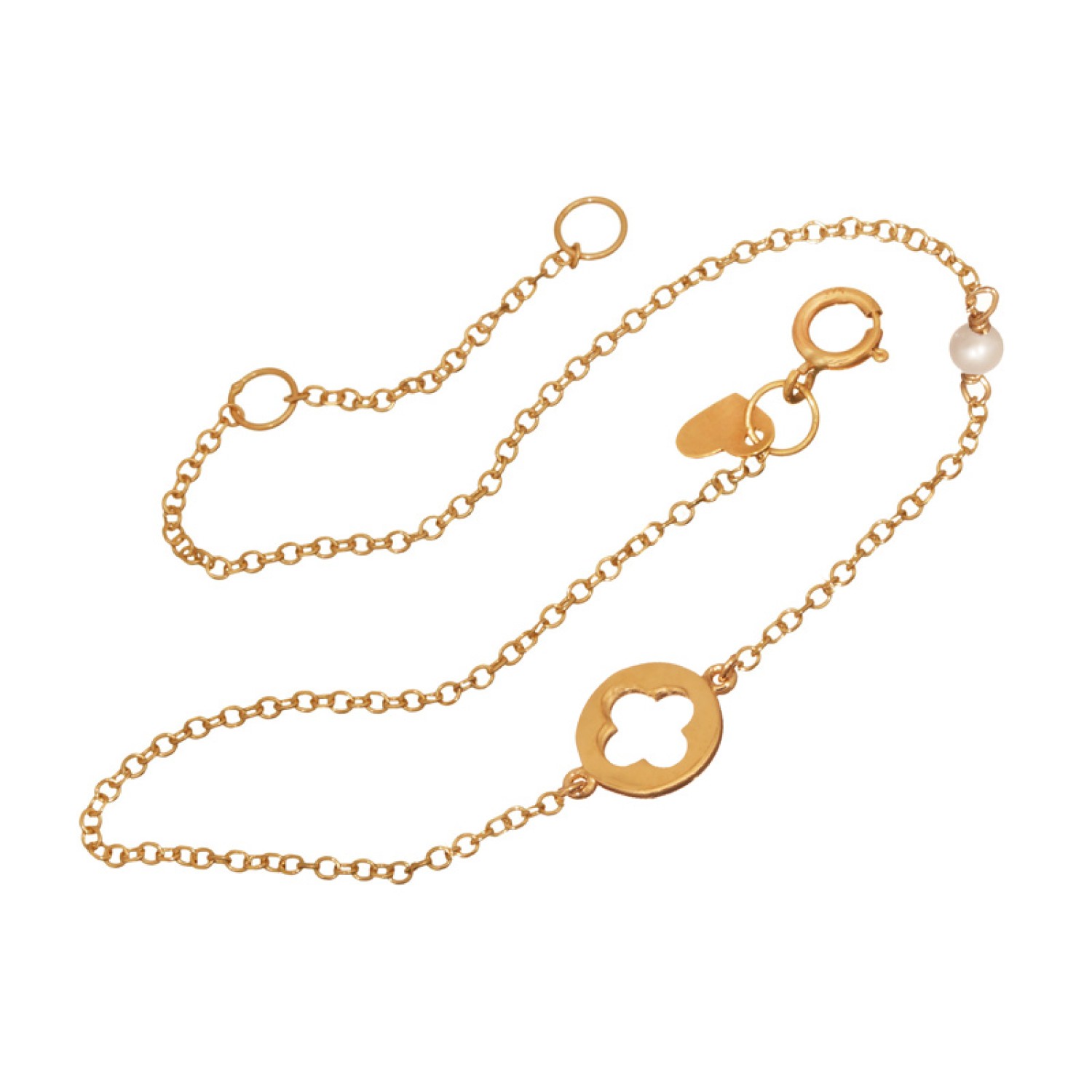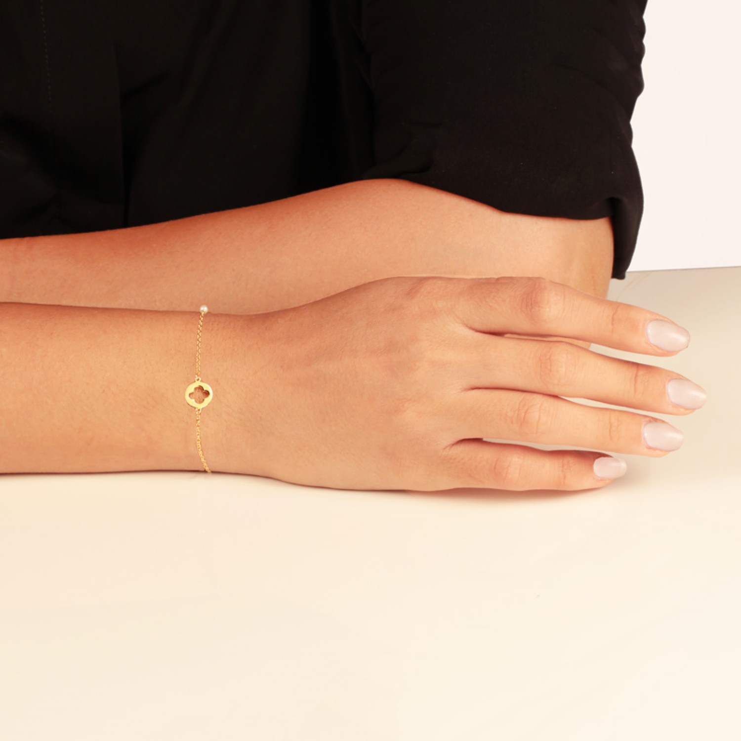 Γυναικείο χρυσό 9 καράτια βραχιόλι με στρογγυλό μοτίφ lazer cut Τετράφυλλο Σταυρό και με ενα λευκό Μαργαριτάρι. Το υπέροχο κόσμημα που θα αγαπήσετε με την πρώτη ματιά. Κομψό και διακριτικό, θα χαρίσει μια νότα λάμψης στις καθημερινές σου εμφανίσεις. Ενα διαχρονικό κόσμημα με ξεχωριστό συμβολισμό που θα φοράτε για πάντα. Η αλυσίδα χεριού διαθέτει ενδιάμεσο κρίκο για να προσαρμόσετε στον καρπό σας. Μια εξαιρετική επολογή και για ενα προσωπικό δώρο που θα δημιουργήσει αγαπημένες αναμνήσεις.
