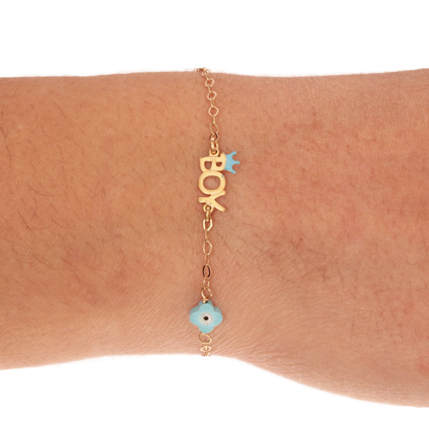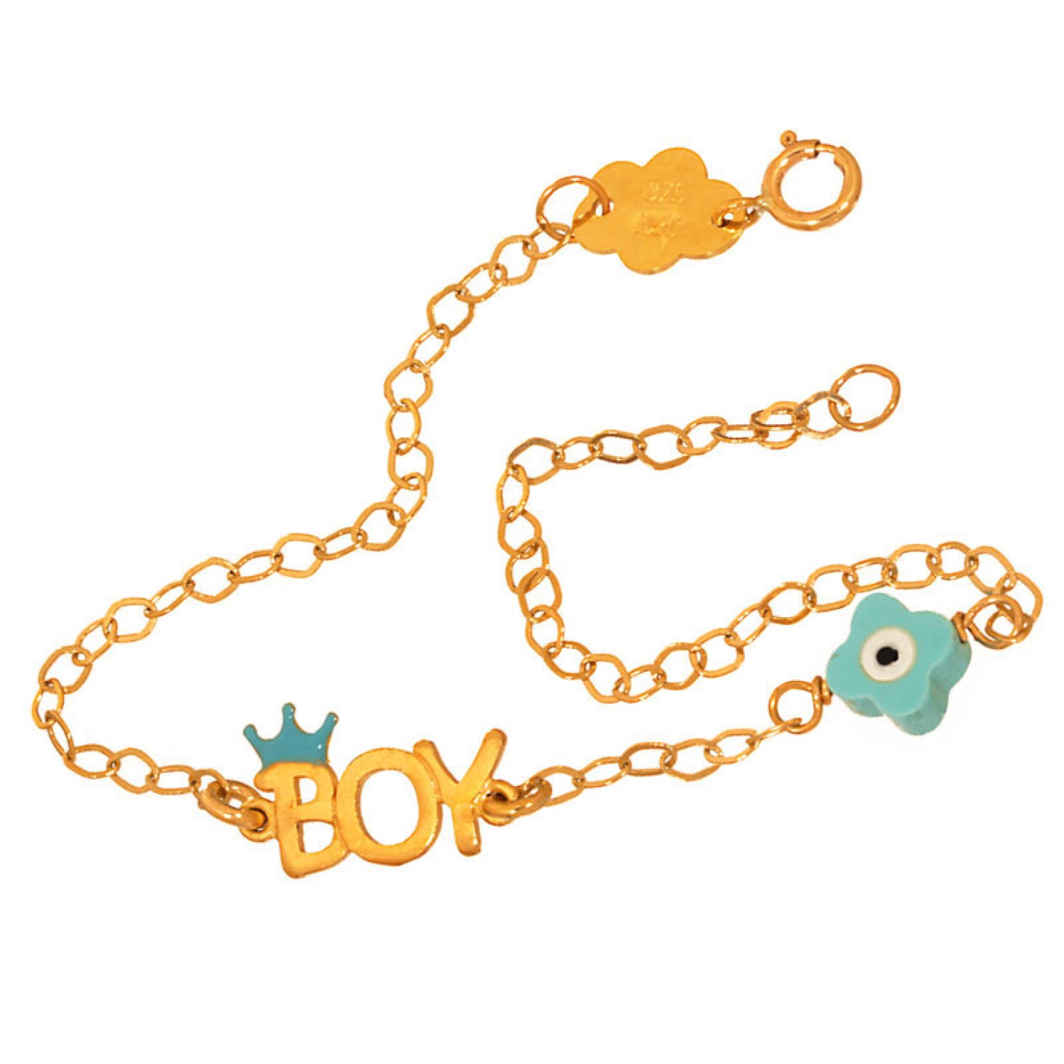 Παιδικό χρυσό 9 καράτια βραχιόλι Boy Αγόρι και Τετράφυλλος Σταυρός Μάτι. Μια Κορώνα φιλοτεχνημένη με σμάλτο συμπληρώνει φίνο σύνολο με χρώμα. Ενα κομψό κόσμημα που συνδυάζει συναισθηματική και αληθινή αξία. Λαμπερό και καλότυχο, θα γίνει ο παντοτινός θησαυρός του παιδιού σας. Μια εξαιρετική επιλογή και για ενα πολυτελής δώρο Γέννησης ή Βάπτησις σε μια νέα μαμά.
